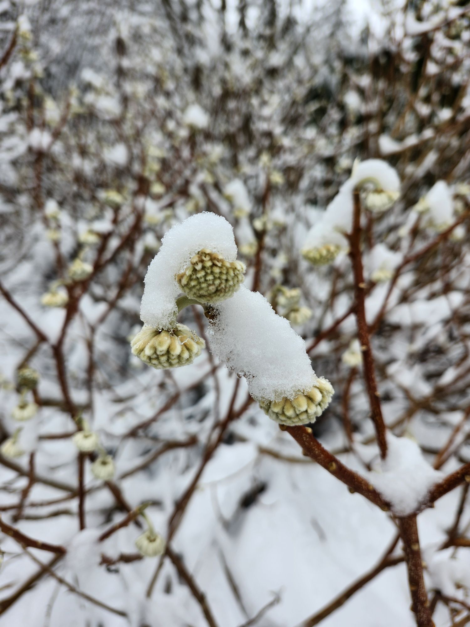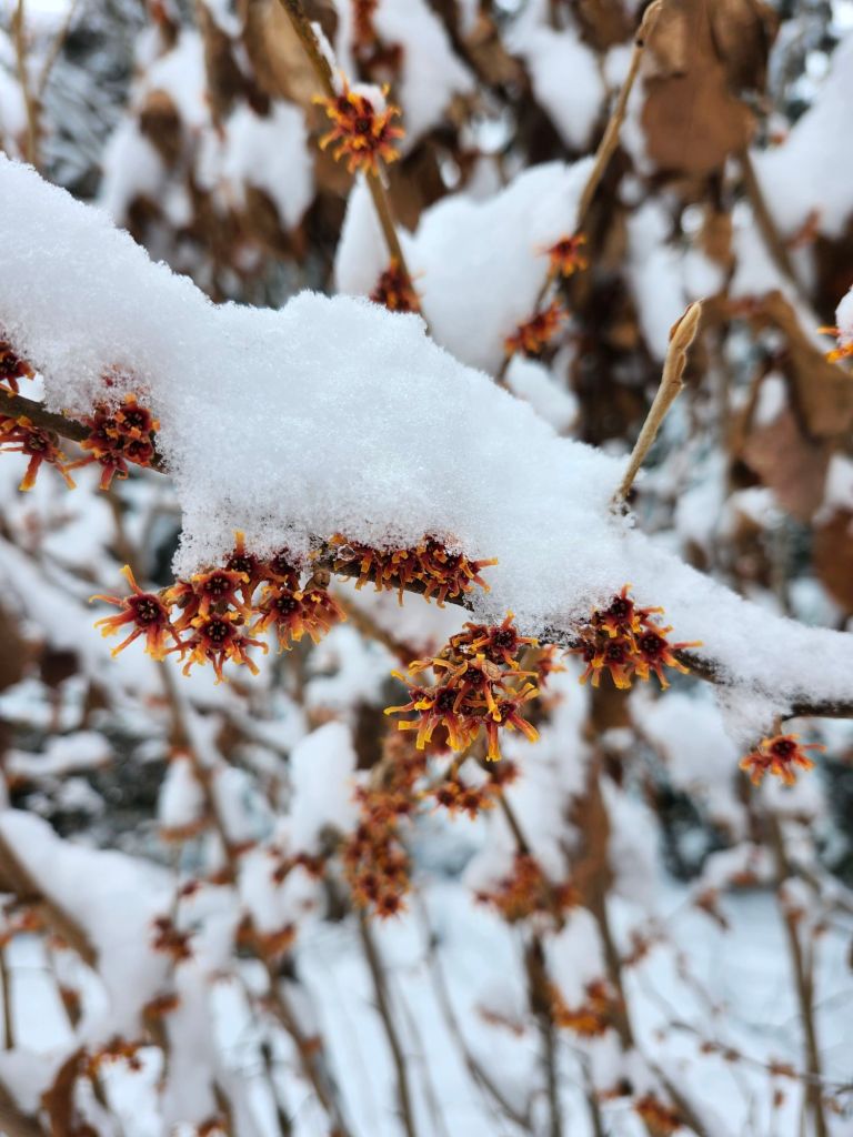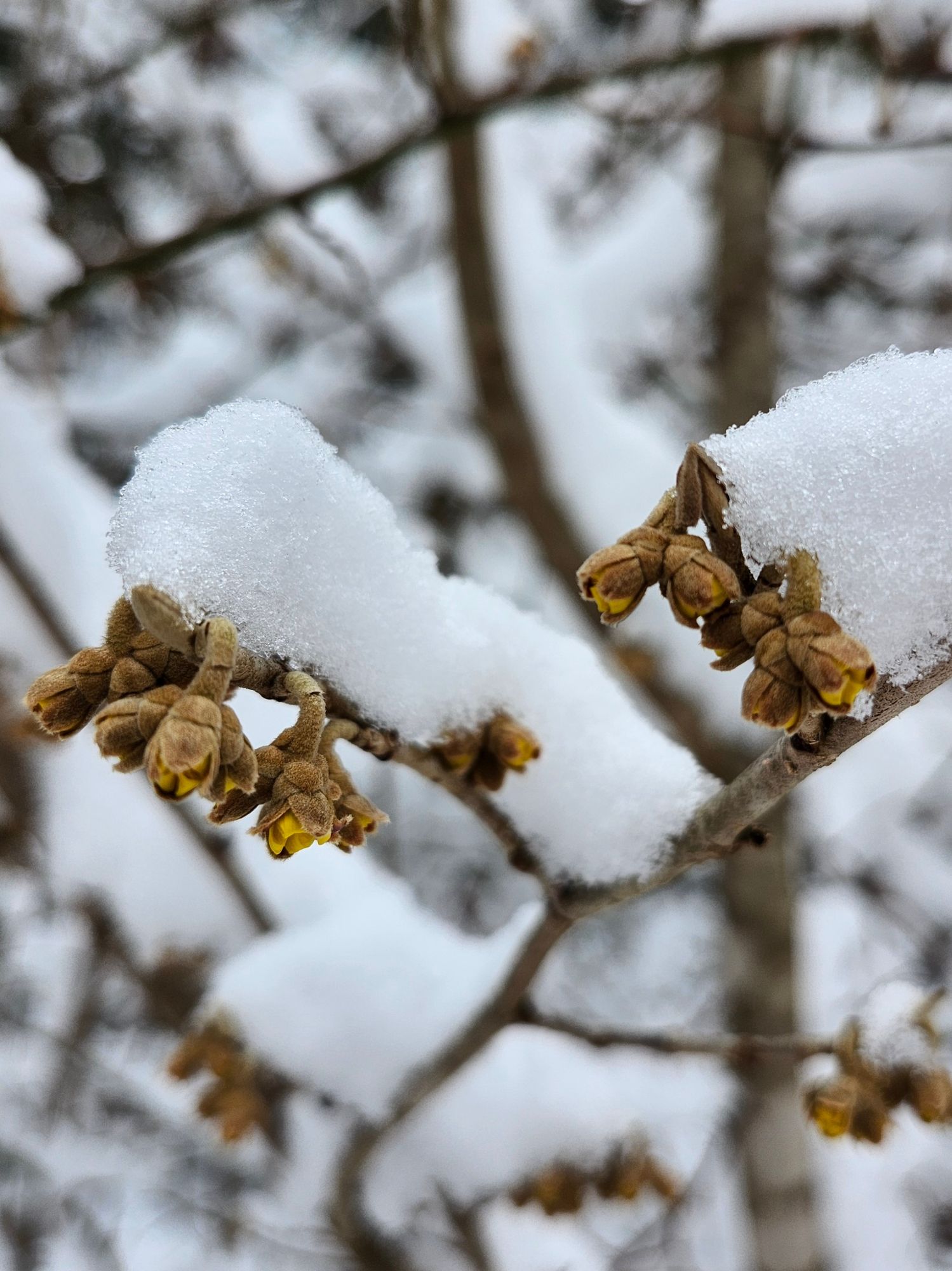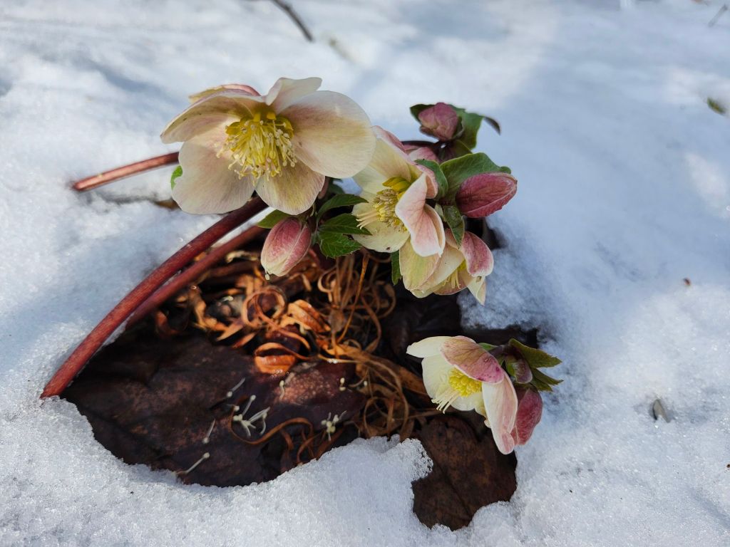 Beyond bending and potentially breaking branches, the snow does not delay flowering of shrubs. No doubt, hellebores (below) and the various bulbs that will be hidden from sunlight will be slightly delayed, but this snow should mostly be gone in four or five days.