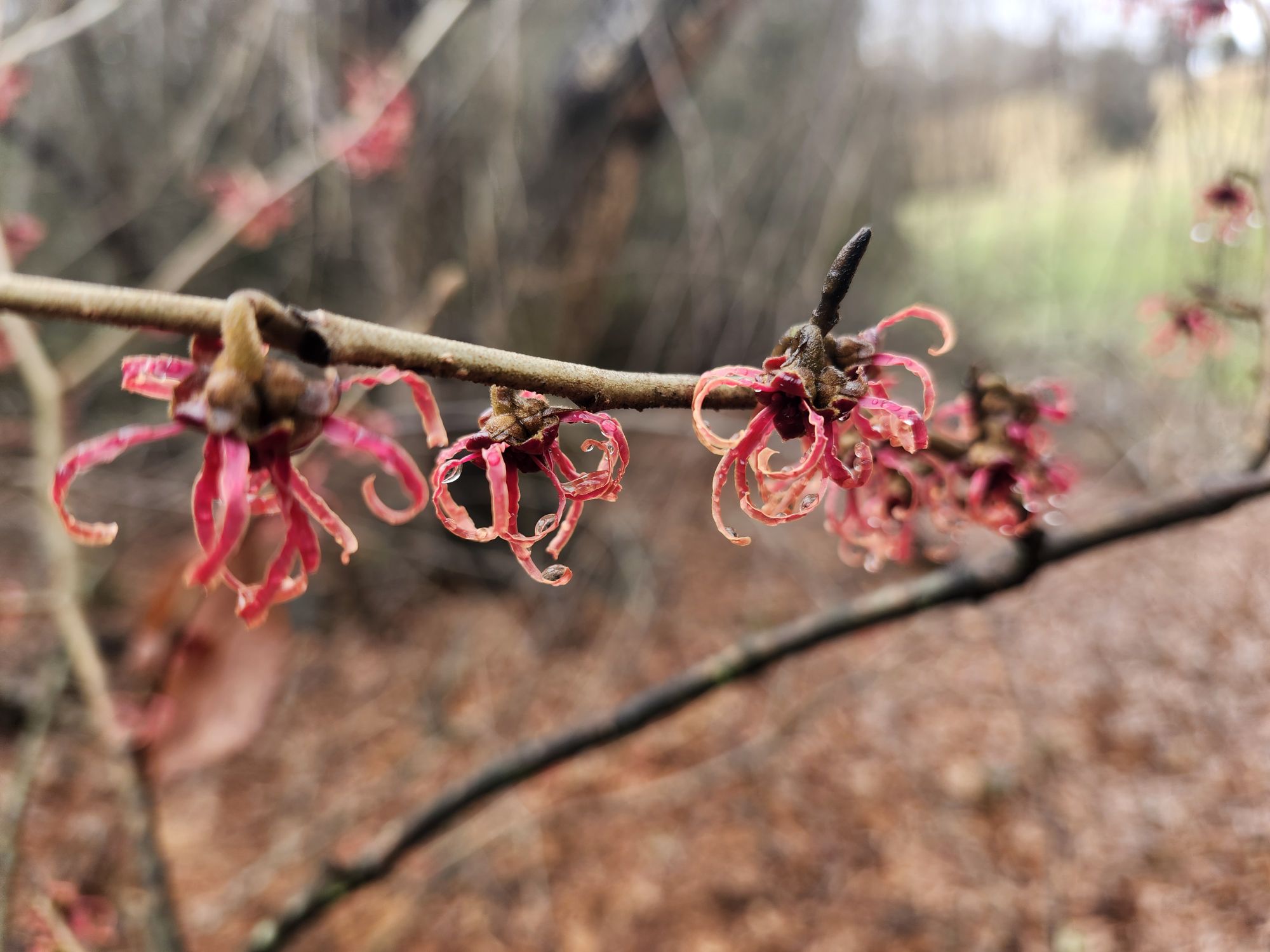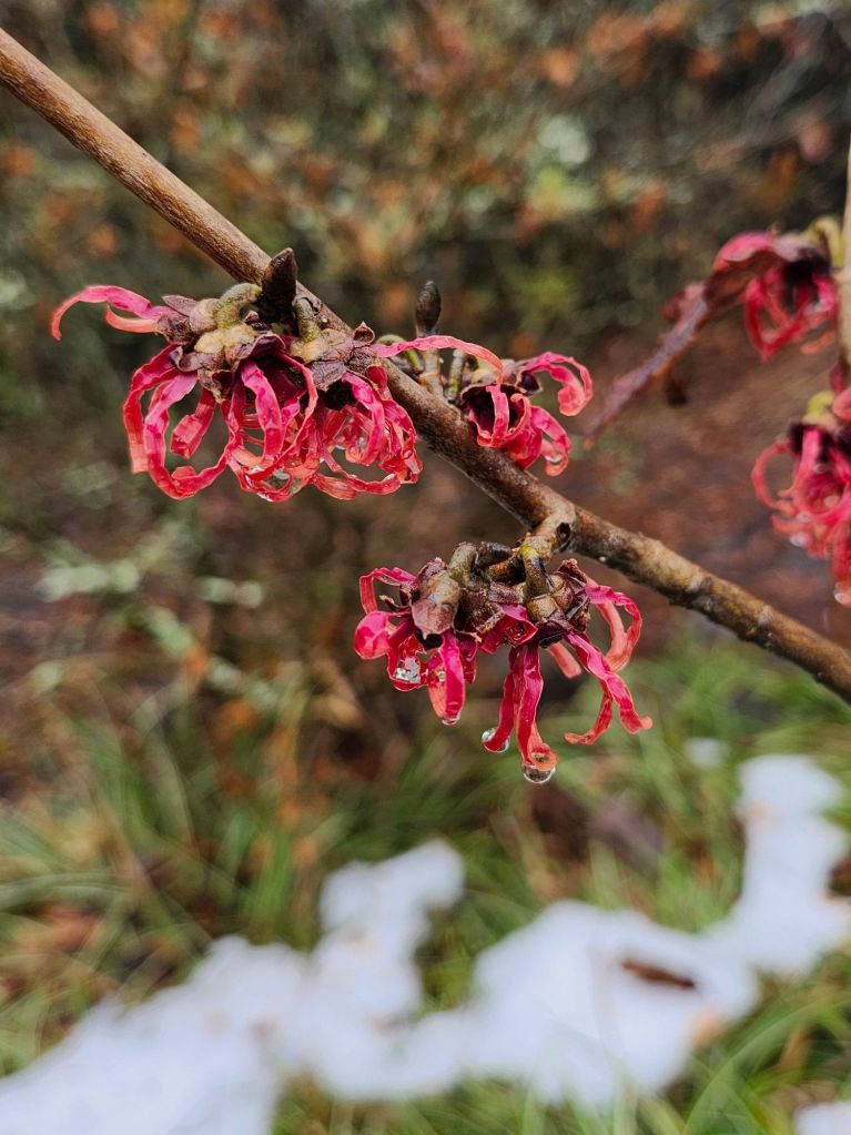 Slowly, flowers of the Asian hybrid witch hazels (Hamamelis x intermedia) have unfurled, tardy, but another signal that spring is close. ‘Diane’ and ‘Jelena’ (below) are first to bloom with several smaller newcomers still sheltered beneath overwintering stems of perennials that will be cut back before new growth begins in several weeks. With spring’s growth, the small witch hazels should rise above their neighbors. Two tall ‘Arnold Promise’ are last to flower with bright yellow showing through buds that are cracking open.