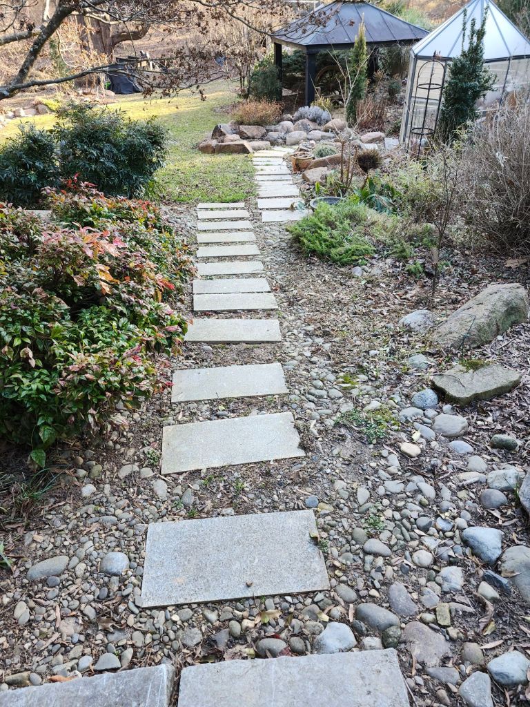 The granite stone path (below) to the rear garden is a mess. There’s just enough slope that the stones slide when the ground’s damp, which is most of the winter. Path stones have slid and been knocked cockeyed, so most will need to be reset. This isn’t a huge project, but another few hours to add to the busy week.