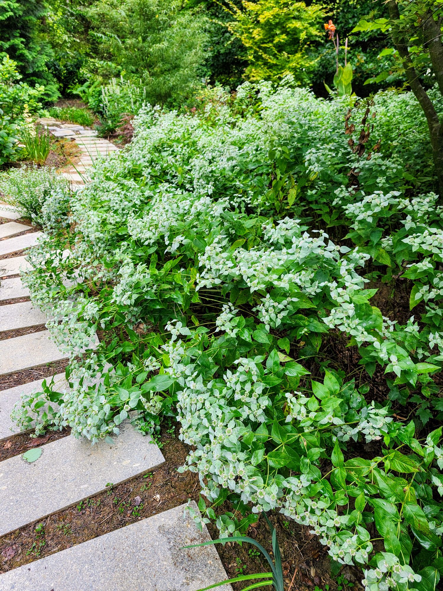Fortunately, the mountain mint clump has forged ahead into sunnier spaces, and while its spread is easily controlled if it encroaches on neighbors, I’m pleased that a substantial colony remains. The fading remnants of the original mountain mints are still visible beneath the low tree canopy, so I will transplant small Ostrich ferns that continue to pop up since a large colony was removed in the upper rear garden a few years ago.