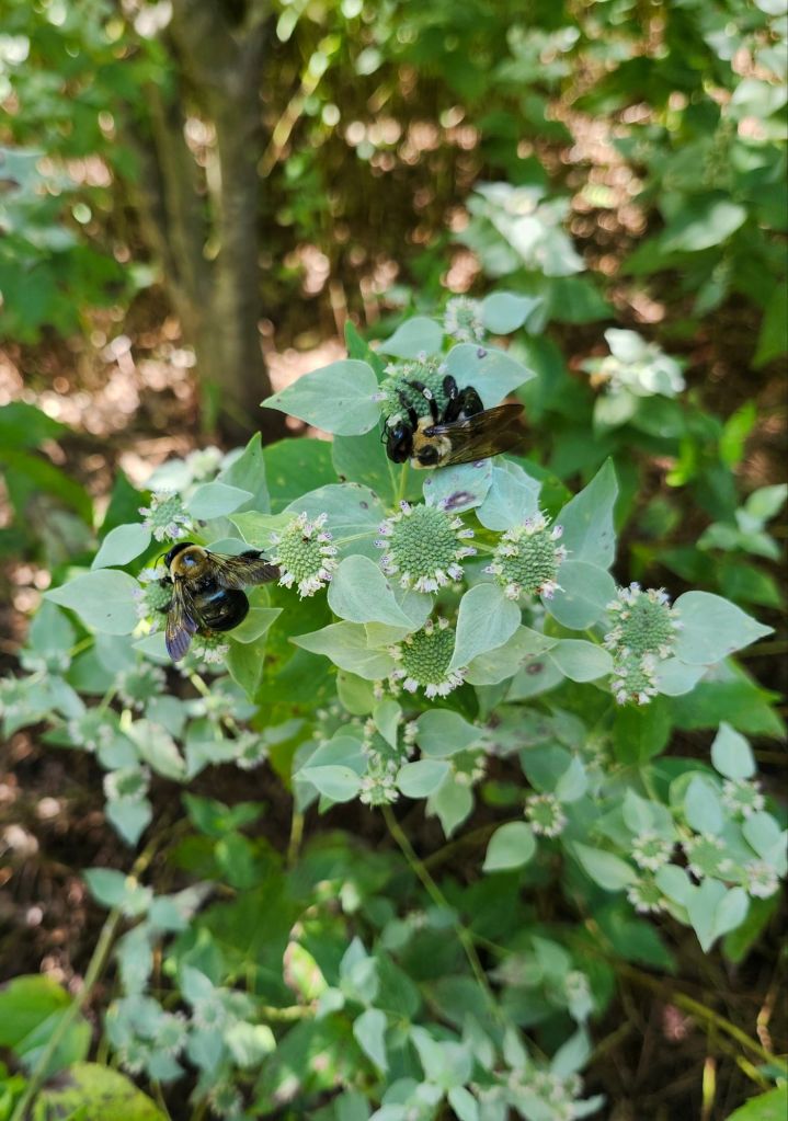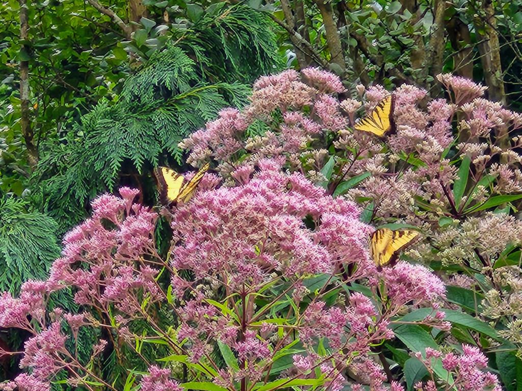 This garden is a mix of natives and non-natives, and over the years, it has become a haven for wildlife. Some plants are valued for their beauty and others for their value to pollinators. Mountain mint and Joe Pye are attractive, but both are treasured for their value to pollinators.
