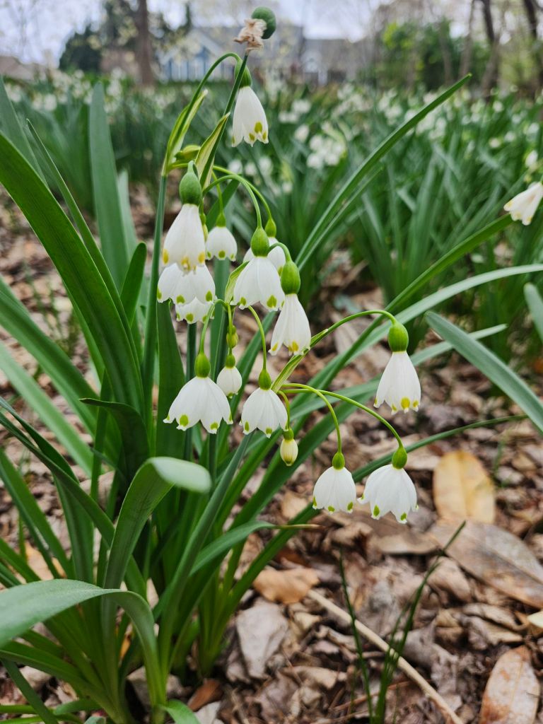 In the shade of the Bigleaf magnolia (Magnolia macrophylla), the clumps of Summer snowflakes (Leucojum aestivum, below) have begun to fill an open space that extends just beyond the garden’s border. I’m happy to see new plants alongside the thickening clumps that will be even better a year from now.