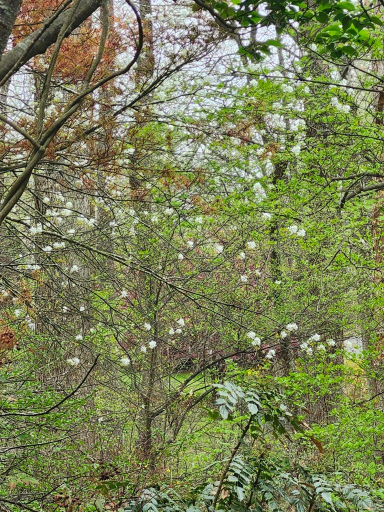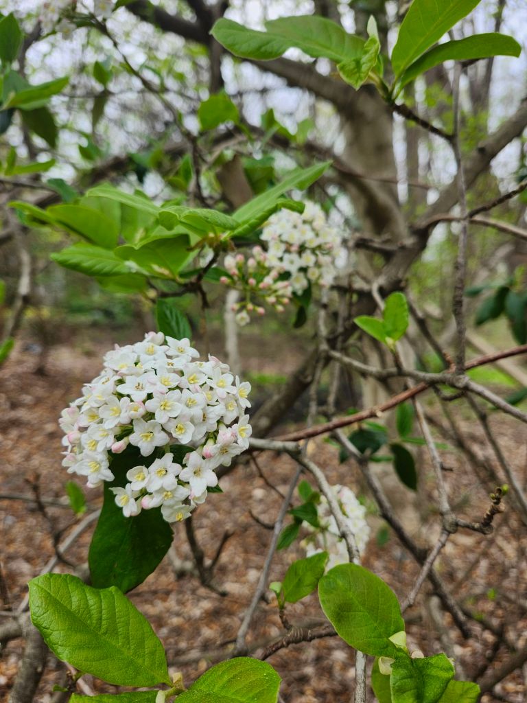 While a second viburnum perished in the shade,  Burkwoodi has more open branches that find gaps to bring fragrant blooms to the forest’s edge.