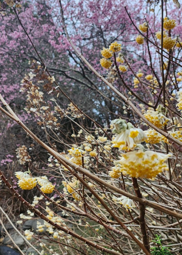 I will always enjoy planting, filling whatever small nooks where a Solomon’s Seal or mayapple might be squeezed in, but there is joy in watching a paperbush (Edgeworthia chrysantha, above) crowd its neighbors with exuberant growth. What do I do now? I recall when I wished for the small, newly planted shrubs to hurry along to fill gaping open spaces.