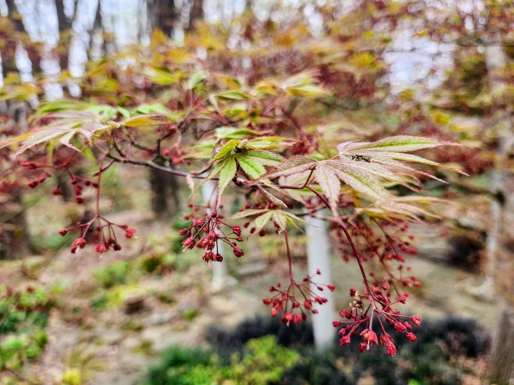 Until recent years, branches of serviceberry (Amelanchier canadensis, above) and a Japanese maple were pushed aside to travel the path beside the stream. I’ve long forgotten if this was planned, but today, I’ll take full credit walking beneath this canopy of emerging foliage and blooms. Lowest branches of the serviceberry have been lost in the shade, but its flowers take the place of fading magnolias in the view from the sunroom. Soon, leaves of the Japanese maple (below) will hide the serviceberry from view in the progression of one flower to the next, then to colorful, finely dissected leaves.