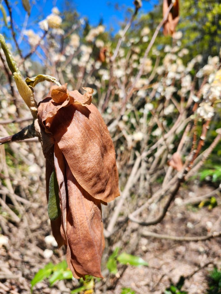 The morning after, I don’t know the extent of the damage. Tender leaves are off color, with some drooping. Certainly, some will be lost, hopefully not all, and some are likely to get through with minimal damage even if others suffer.