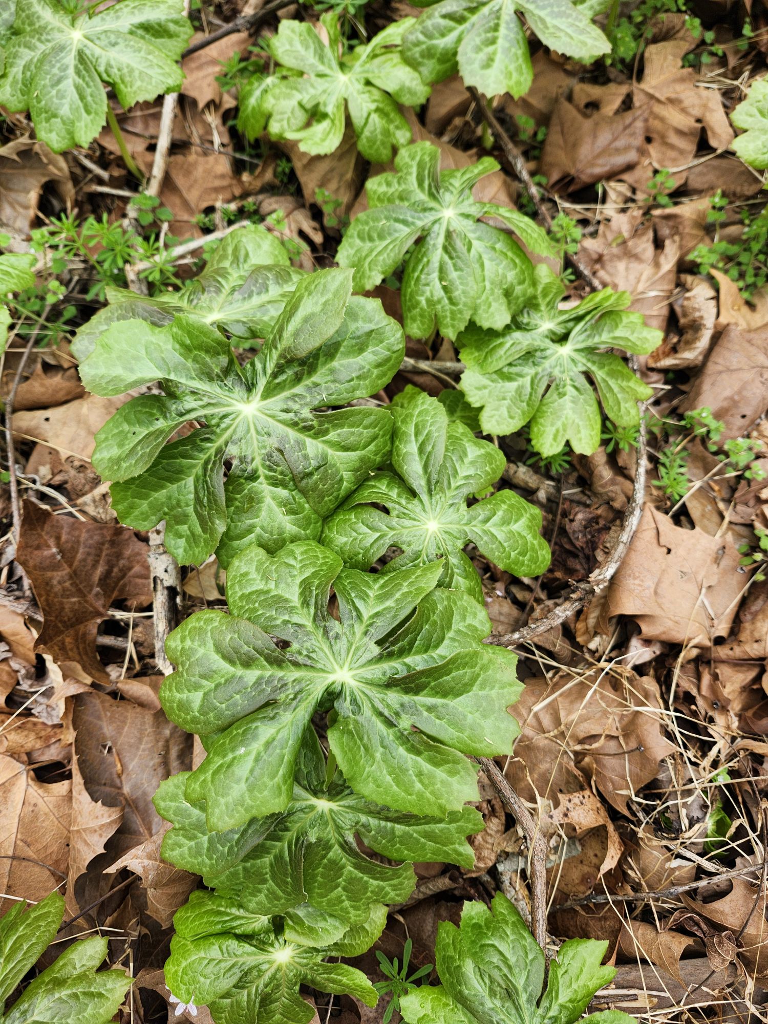 I’ve planted a number of native (Podophyllum peltatum, below) and Asian mayapples in the garden, but I always enjoy seeing them in the wild. The native mayapples rarely persist into the heat of summer, but they’re a favorite of mine even though the flowers are barely noticed beneath the large leaves.