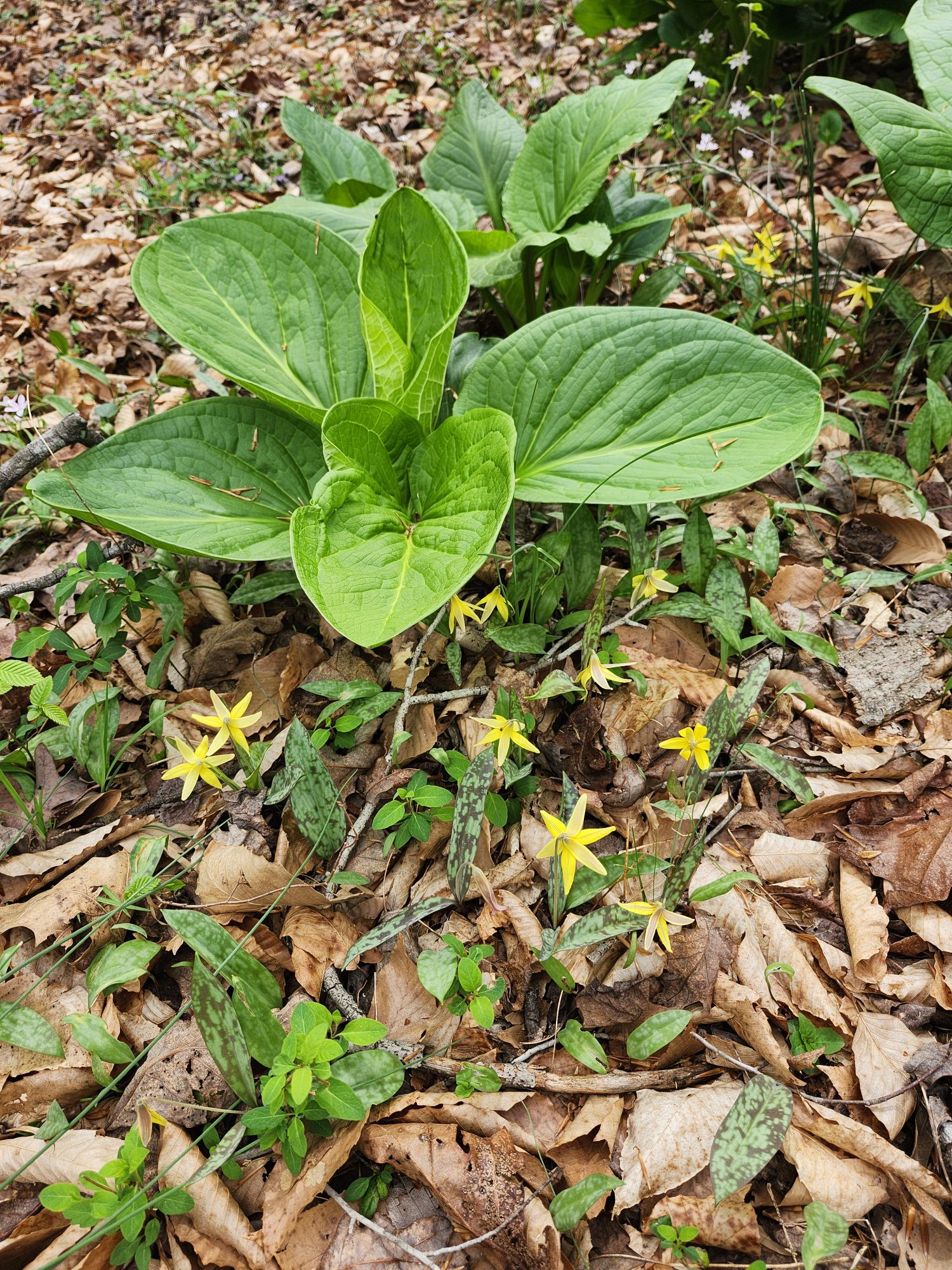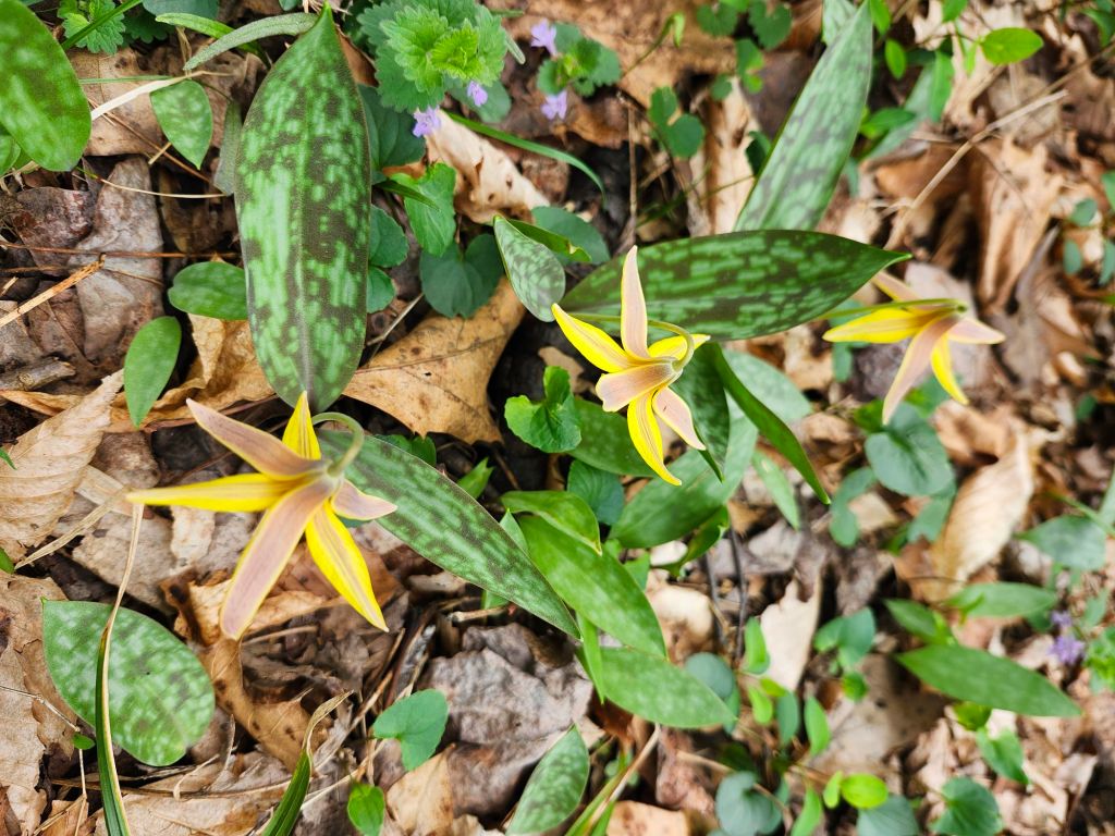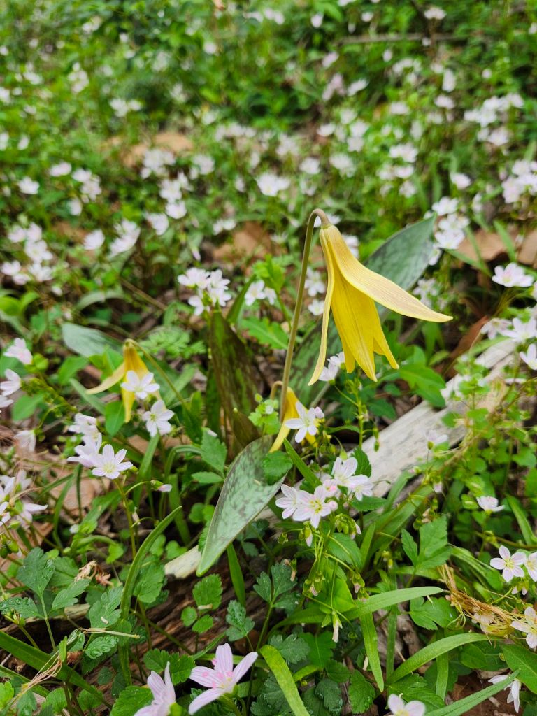 I’ve been whining that somehow, the one large clump of trout lilies (Erythronium americanum, above) in the garden has disappeared, and of the many dozens that were more recently planted, none are flowering. So, when we hiked down the slope to Bull Run, there were abundant bluebells on one side of the trail through the flood plain and trout lilies on the other. Only one was flowering of the hundreds in this first group, but as we hiked further, there were many thousands and many trout lilies in bloom (below).
