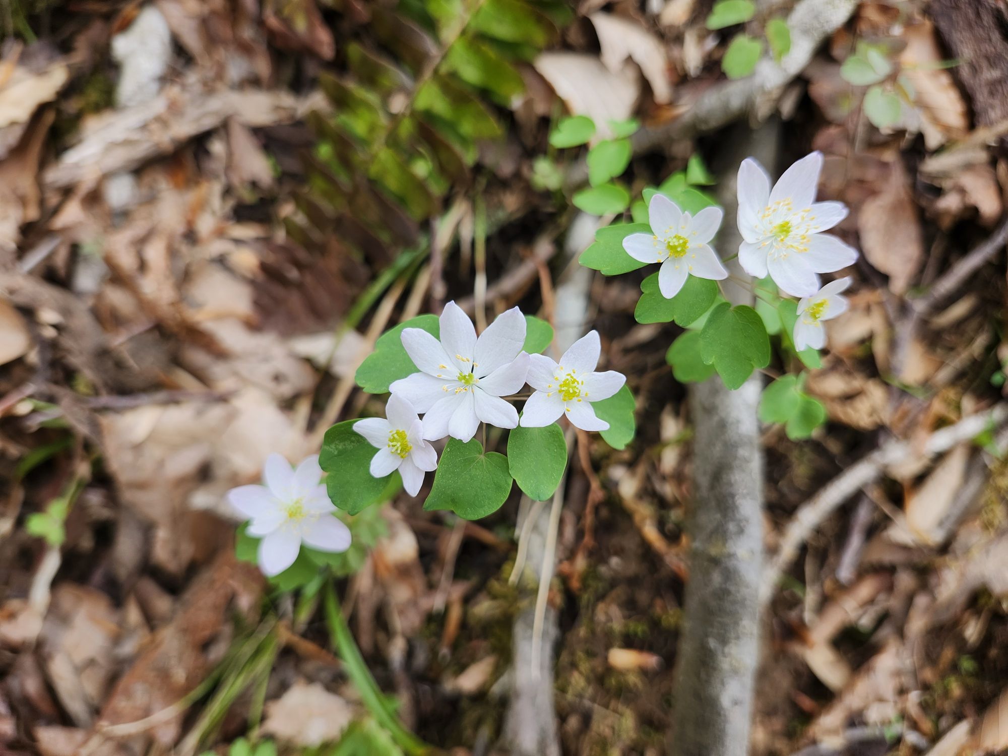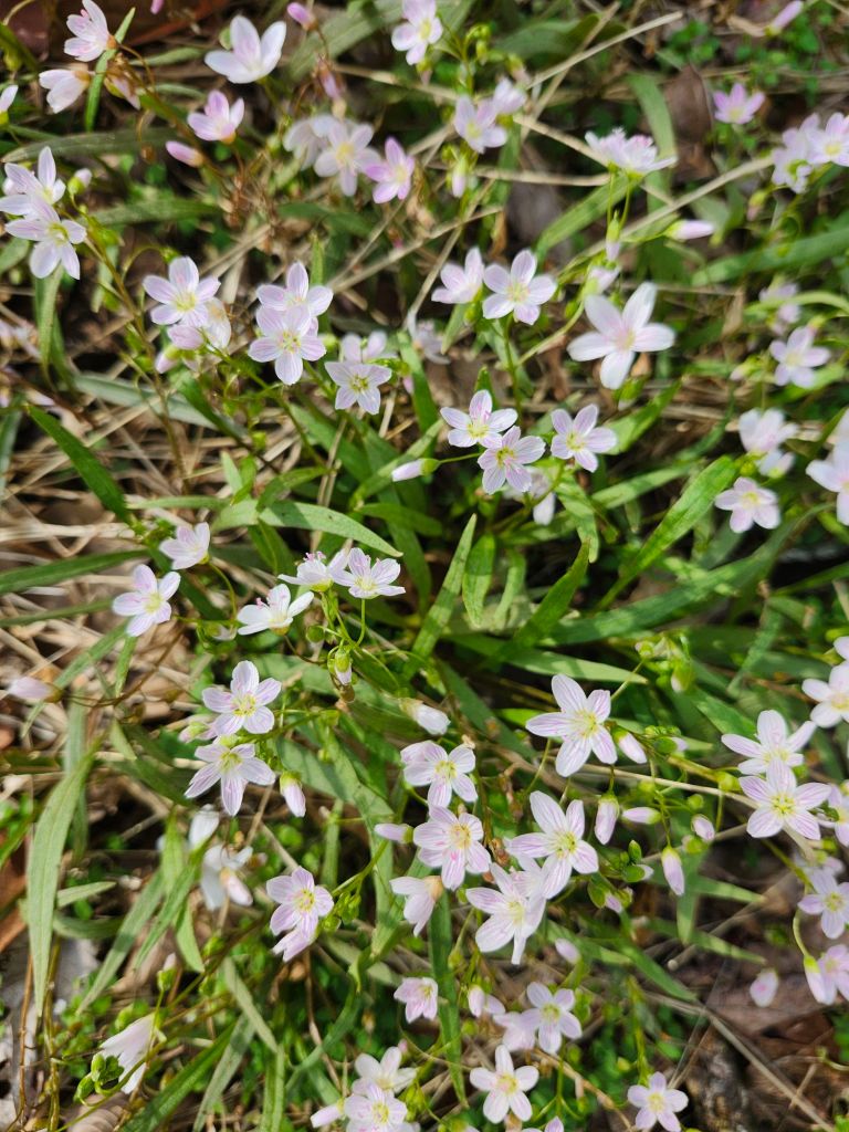 Our usual bluebell hike has scattered patches of other wildflowers, and we frequently noted that Virginia springbeauties (Claytonia virginica, below) did not clump densely. But not here, where large swaths filled areas not occupied by bluebells and trout lilies.