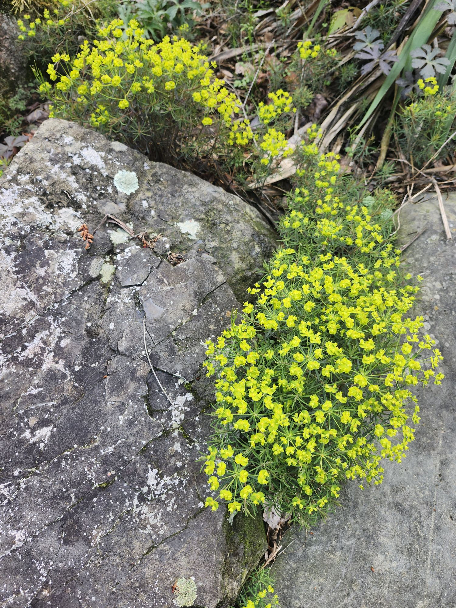 In any case, the tiny bit of spurge that was saved from the geranium’s onslaught was transplanted to where it could spread between boulders bordering the koi pond (above). Here, it has spread slowly to fill gaps between stones. I can think of no plant better suited to add color and texture, with my only concern that a seedling of the geranium has set up residence nearby. I will not allow the geranium to bully the spurge again, though I am quite happy with the current arrangement where both geranium and cypress spurge can thrive.
