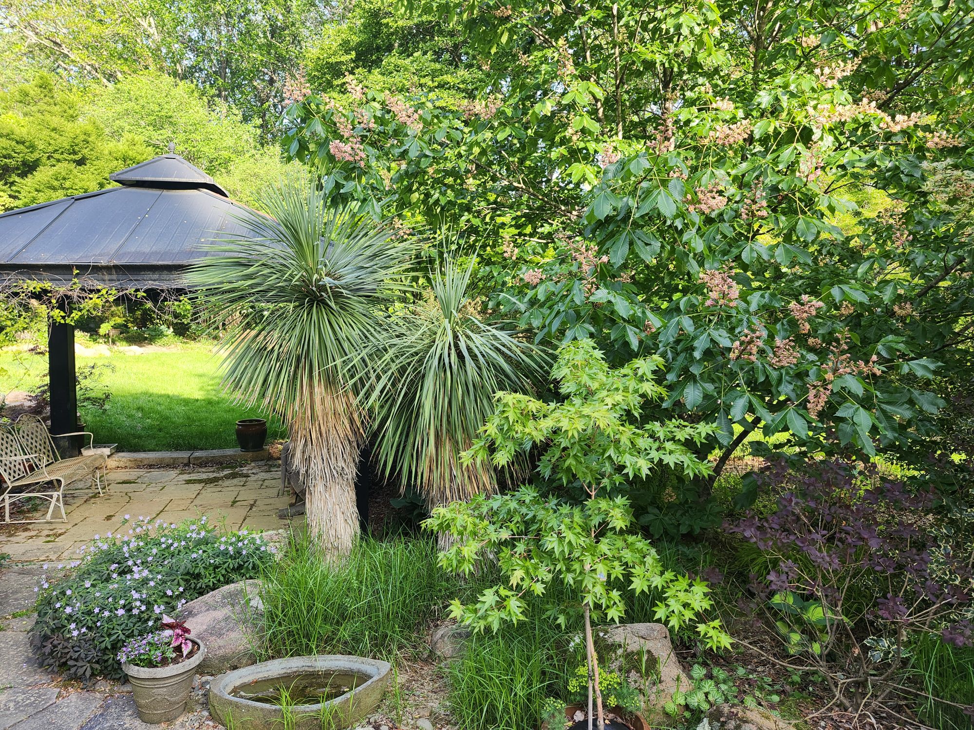 In a few years, I’ll have to remove a few of the lower branches, but the tree is glorious in flower. And neighboring plants are not bothered by its shade.