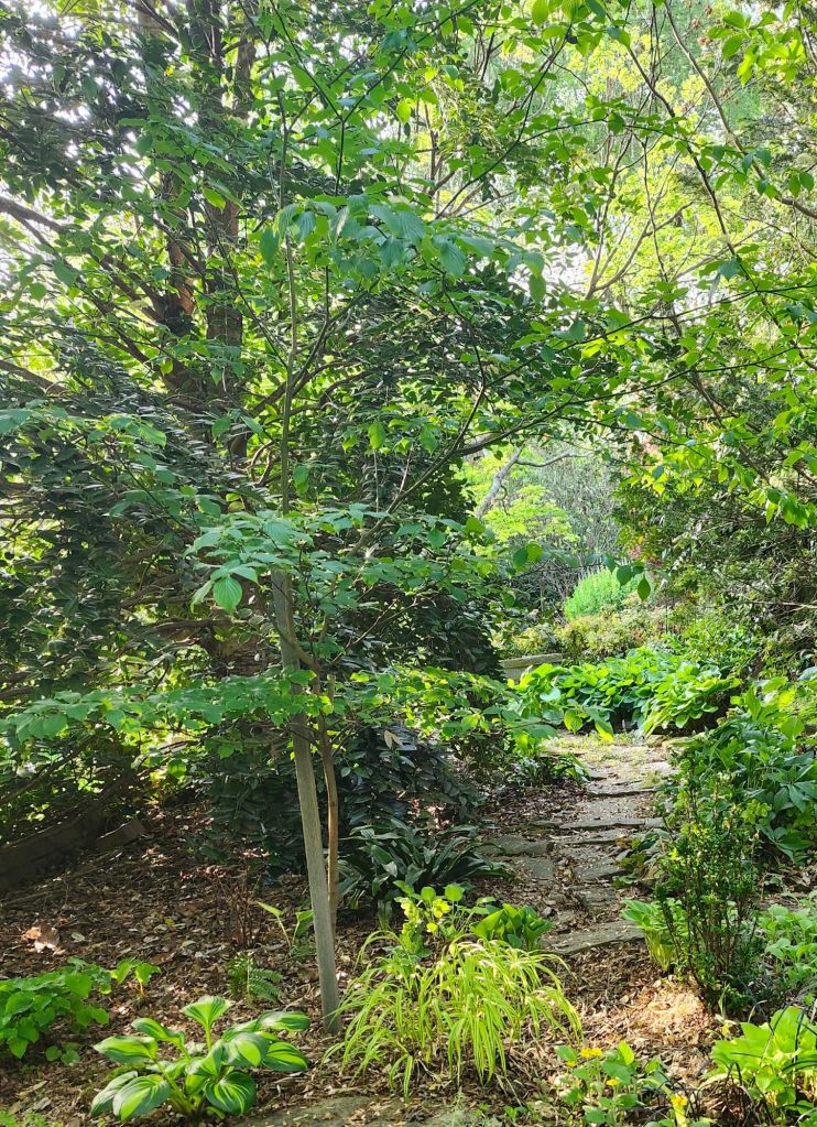 And here is where my plan has succeeded. The horizontal branching of the Pagoda dogwood by the patio could obstruct the adjacent path, but the branch is just high enough for me to duck under, just as I intended. For whatever reason, I have a thing for duck-unders, I suppose, in part because this allows planting more trees, sometimes under other trees.