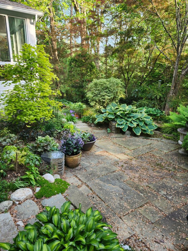 Halfway into the second spring since the renovation of the planting surrounding the upper circle patio, I am overjoyed. The tear out and replanting started to make room for construction of the sunroom that replaced our shabby two level deck. The sunroom has been a four season joy, and I haven’t regretted the planting renovation for a moment.