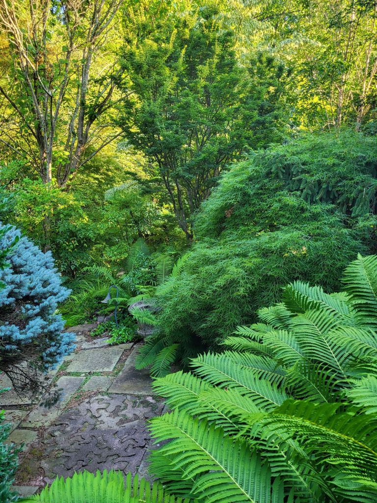 The decades old planting that was torn out was a sore point in the garden, long overgrown and more a space filler than an ornament. Ostrich ferns covered substantial space to one side with a large holly and a wide spreading but declining globose blue spruce filling much of the opposite side beside the deck.