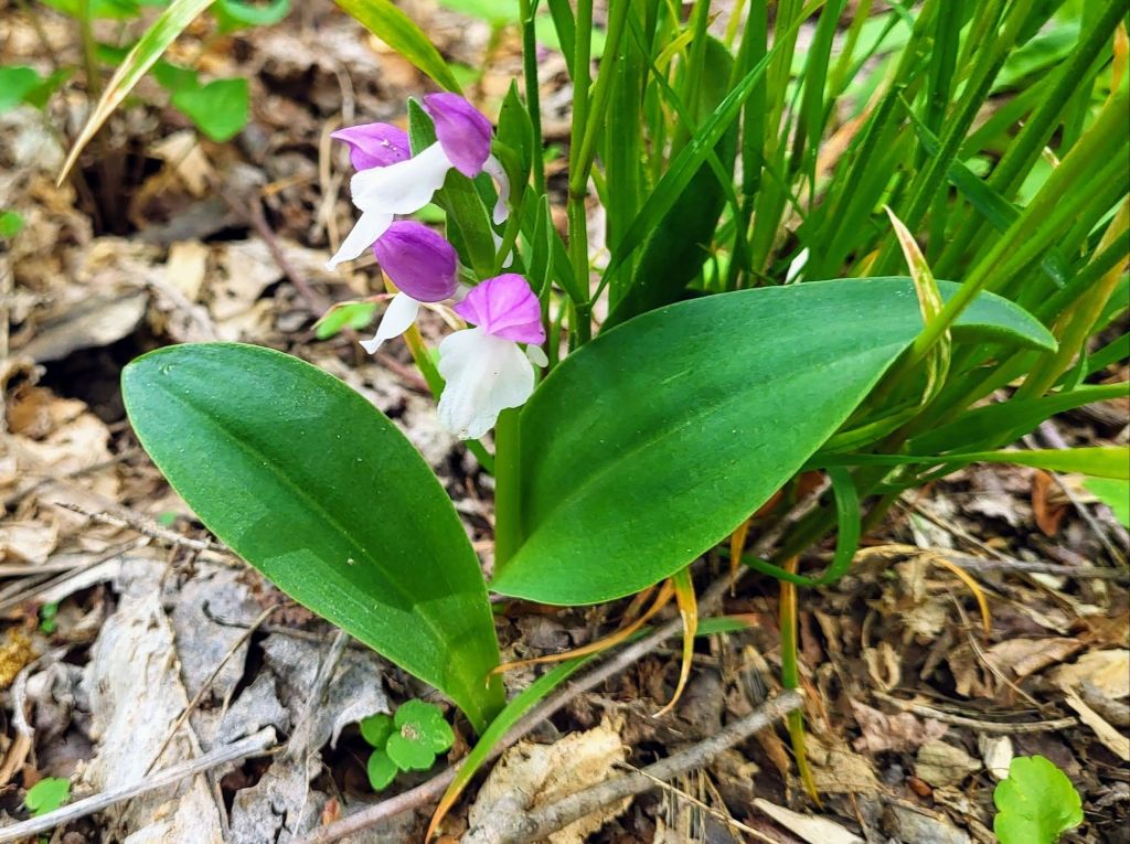 Several native orchids are not so costly, but with smaller flowers that are less showy. Unfortunately, a growing colony of less common purple-leafed Cranefly orchids (Tipularia discolor) was decimated by marauding squirrels in autumn. I hoped by spring a few might appear, but all were dug. Most cranefly orchids have purple undersides and green tops to leaves, but Barbara and I notice a fraction that are all purple in local forests.