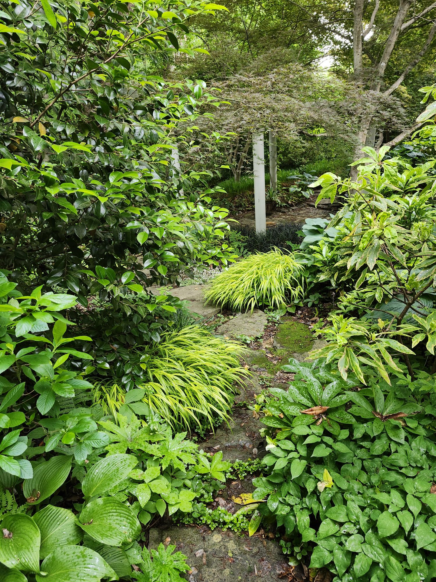 Two Japanese maples were planted along the drive and walk, and two Japanese Umbrella pines (Sciadopitys verticillata) were planted at the front corner of the property and a safe distance from the corner of the house. With trees in place, shrubs and perennials were filled in the shaded spaces with a dwarf bamboo planted below the ‘Seriyu’ at the corner of the house where I imagined heat from the asphalt and root competition could be a problem. Unsurprisingly, the bamboo has thrived, spreading further into the shade than I expected, but creating few issues with only an occasional rhizome spreading under the flagstone walk.