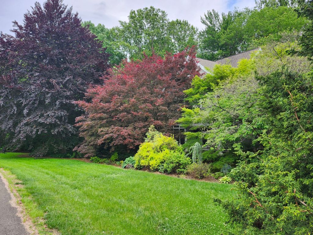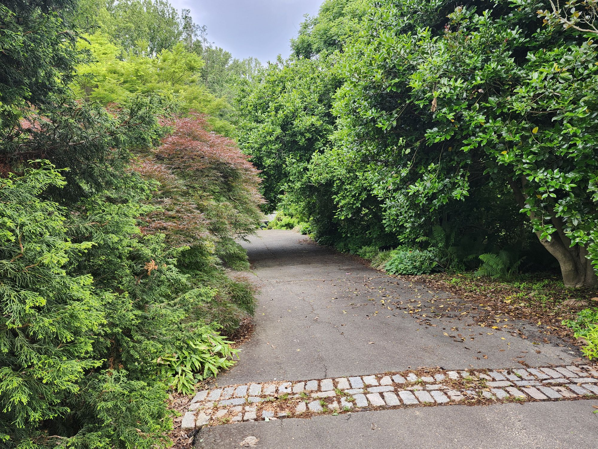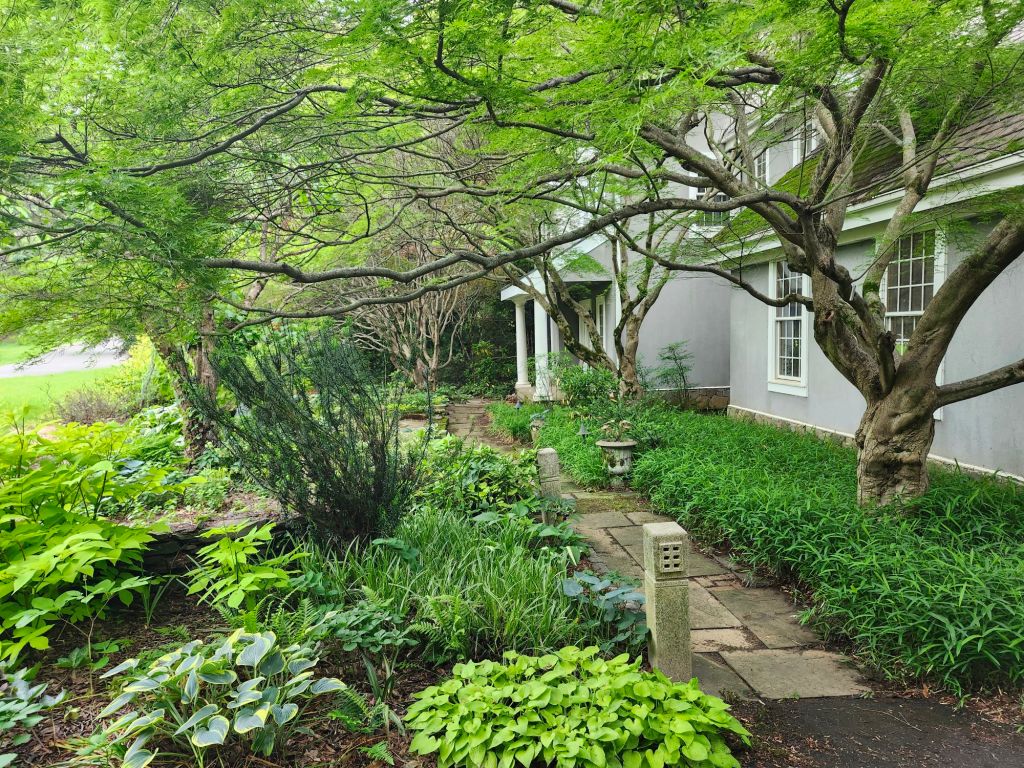 While lower branches of many trees in the garden are kept to slow the pace as the visitor ducks beneath, branches of the ‘Seriyu’ maples were managed to be well above heads. Branches of the maple at the corner of the house extend far over the driveway, meeting halfway across with arching branches of ‘Jane’ magnolia. This is a discouragement to delivery drivers entering the driveway, but only a minor inconvenience since the drive is short in length.