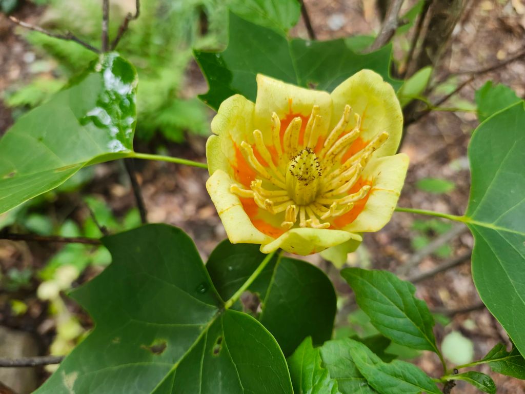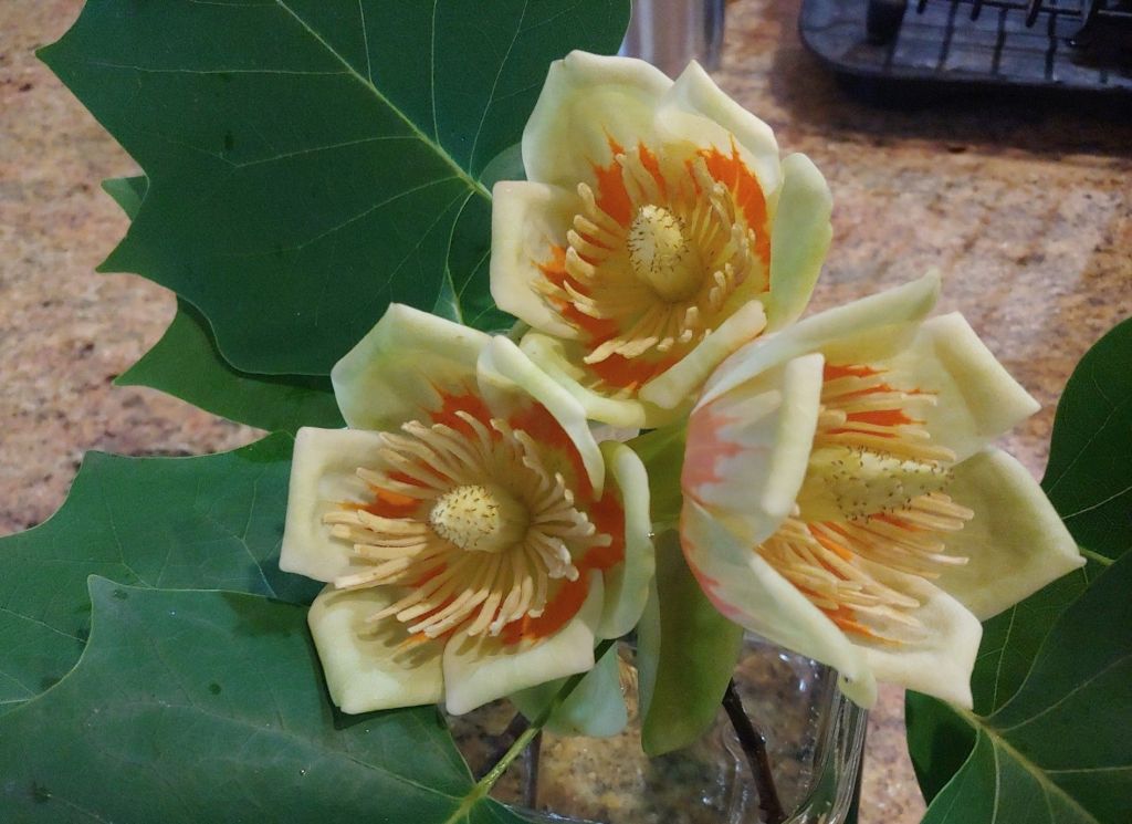As is, flowers of the towering tulip poplars are far too high to be observed except on occasions when branch tips are broken and drop to the ground. Flowers are often intact despite the fall that is likely eased by a parachute of attached leaves, and while the blooms are not exceptional in color, the heavy, waxy flowers are quite interesting.