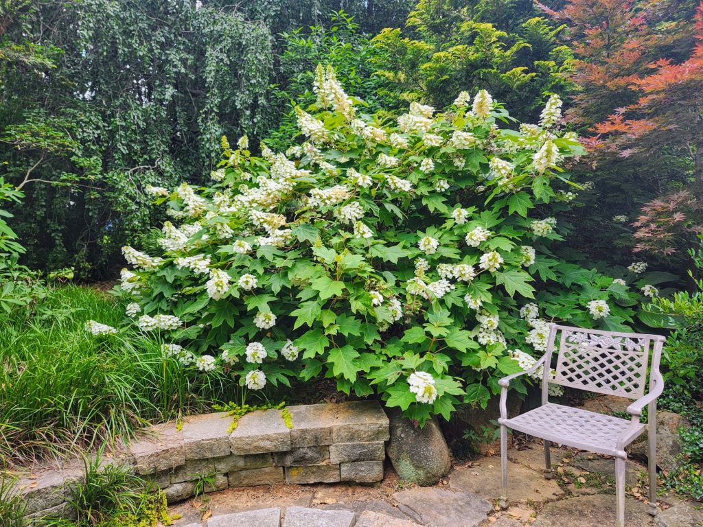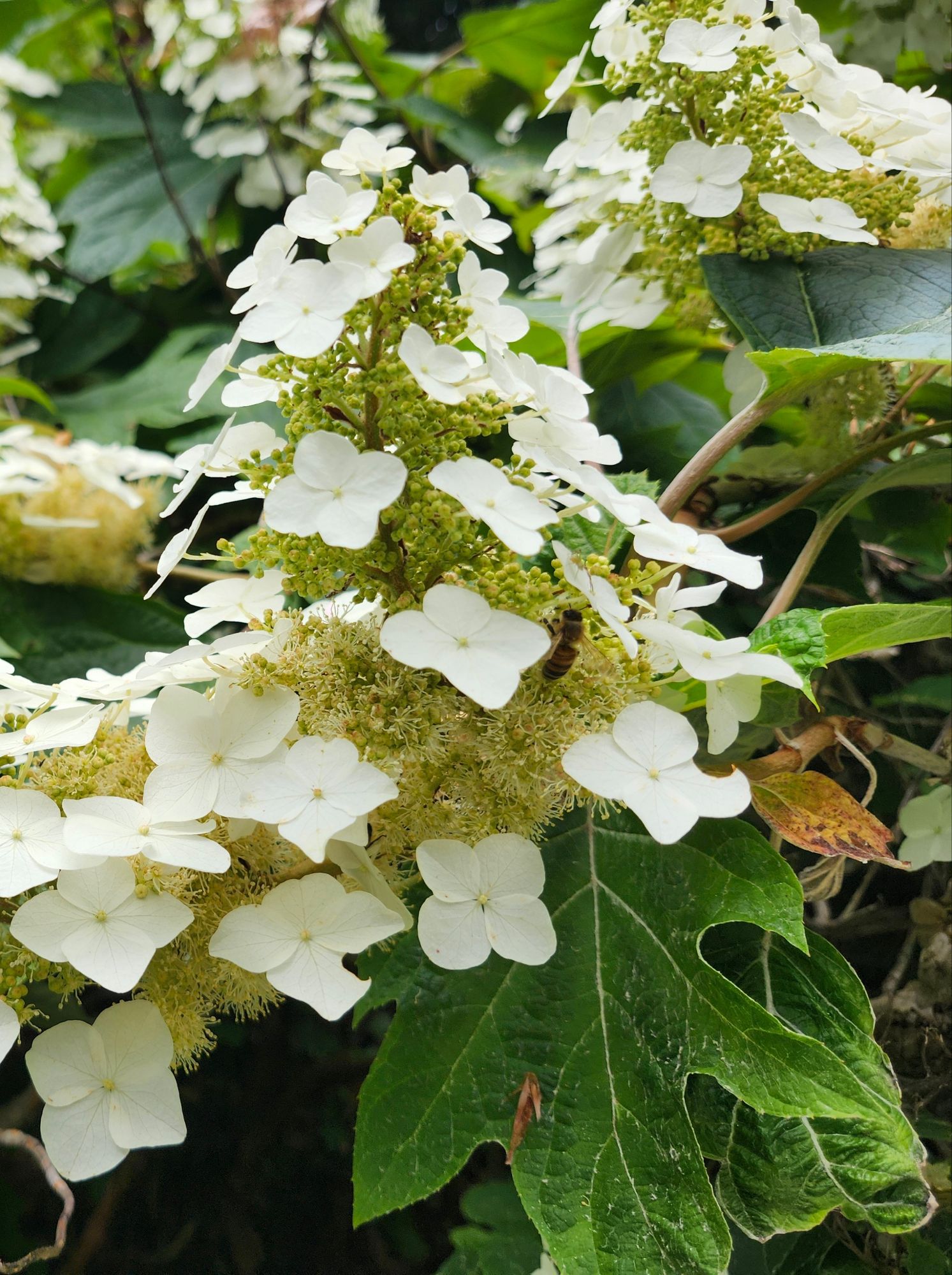 Today, the answer is a single Oakleaf hydrangea (Hydrangea quercifolia, above and below) beside the koi pond patio. There are several more oakleafs in the garden, but all are more shaded with fewer blooms and bees rarely venture into the shaded parts of the garden.