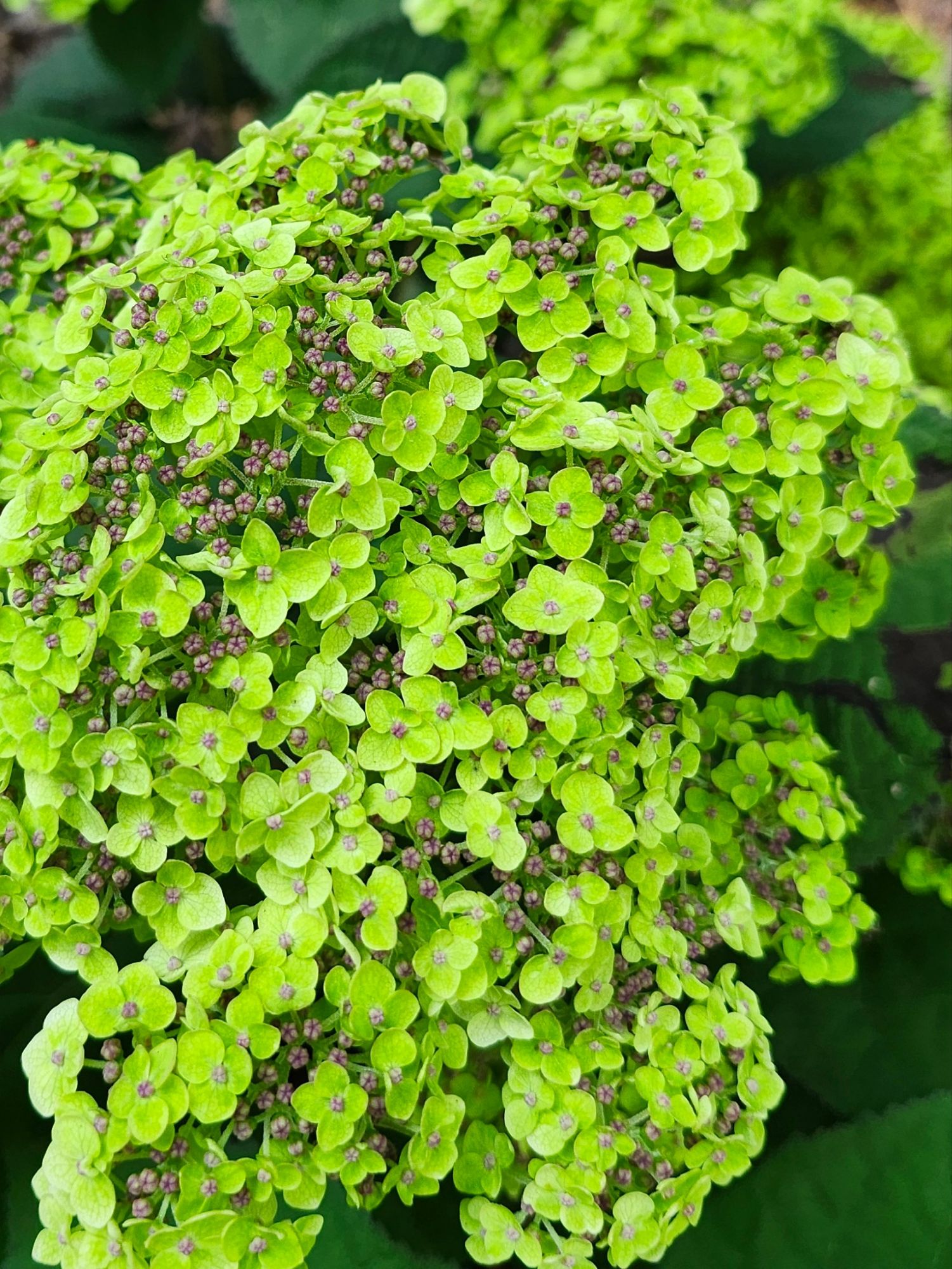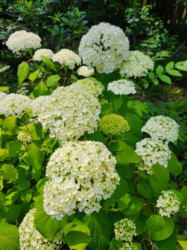 Certainly, there will be a day when pollinators find the ‘Annabelle’ smooth hydrangea (Hydrangea arborescens ‘Annabelle’, below) in part sun in the lower rear garden. Its fertile flowers are not as easily accessed beneath the mophead bloom, but pollinators find a way.