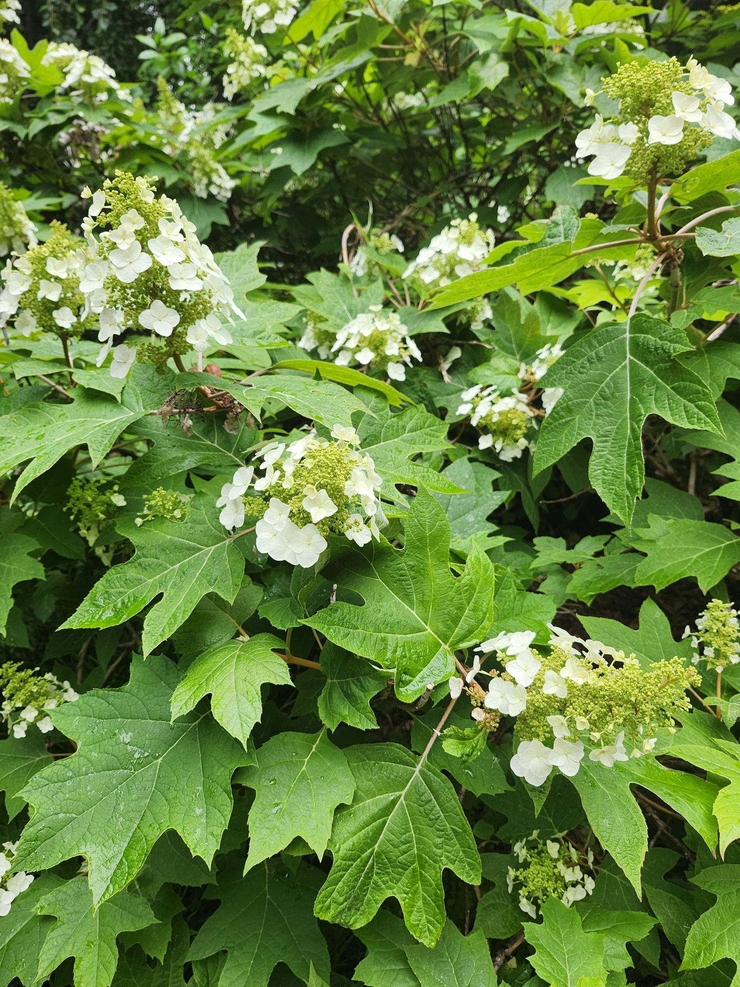 The more shade, fewer flowers are expected on Oakleaf hydrangeas (Hydrangea quercifolia, above). Several in the shaded side garden flower sporadically, but their large leaves define the border of the garden. In part sun, oakleafs flower heavily, and foliage colors deeply in autumn. All in the garden are large growing cultivars, but some are commonly available that grow more compactly.