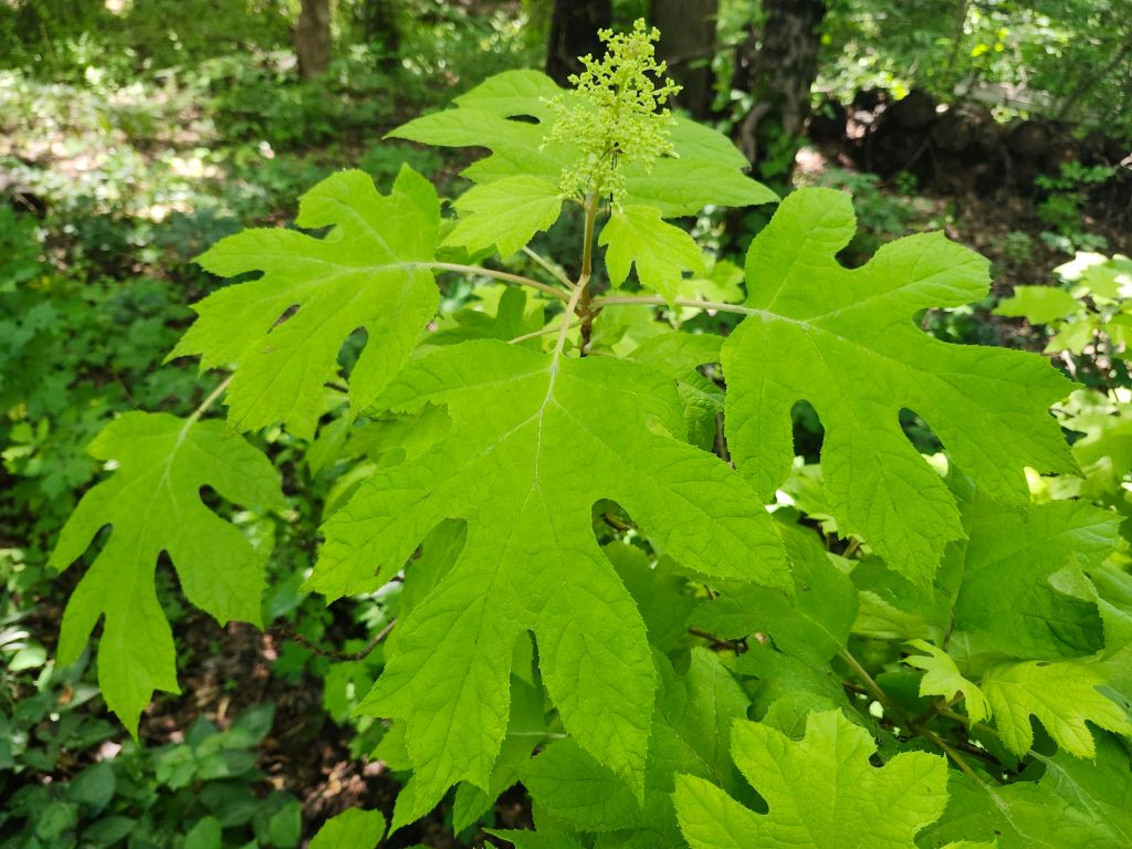 The yellow-leafed ‘Little Honey’ Oakleaf hydrangea (above) remains a partial mystery as it grows in good health since it was moved from a nearly full sun location to a much shadier position. But, it has few flowers and this year there is only a single bud. The hydrangea will remain in place, and perhaps I can fiddle with the tree canopy to bring in a bit more sunlight. In any case, the foliage is superb, and far better than when leaves were scorched by the summer sun.