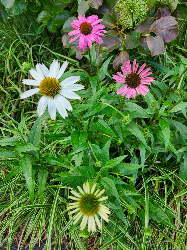 The coneflowers (Echinacea purpurea) are coming into bloom along the driveway. Unsurprisingly, every year there are a few more of the native pink-purple and a few less of the white flowers I planted long ago. I suppose that coneflowers are short-lived, and seedlings are unlikely to be white, but purple or white, bees enjoy both.