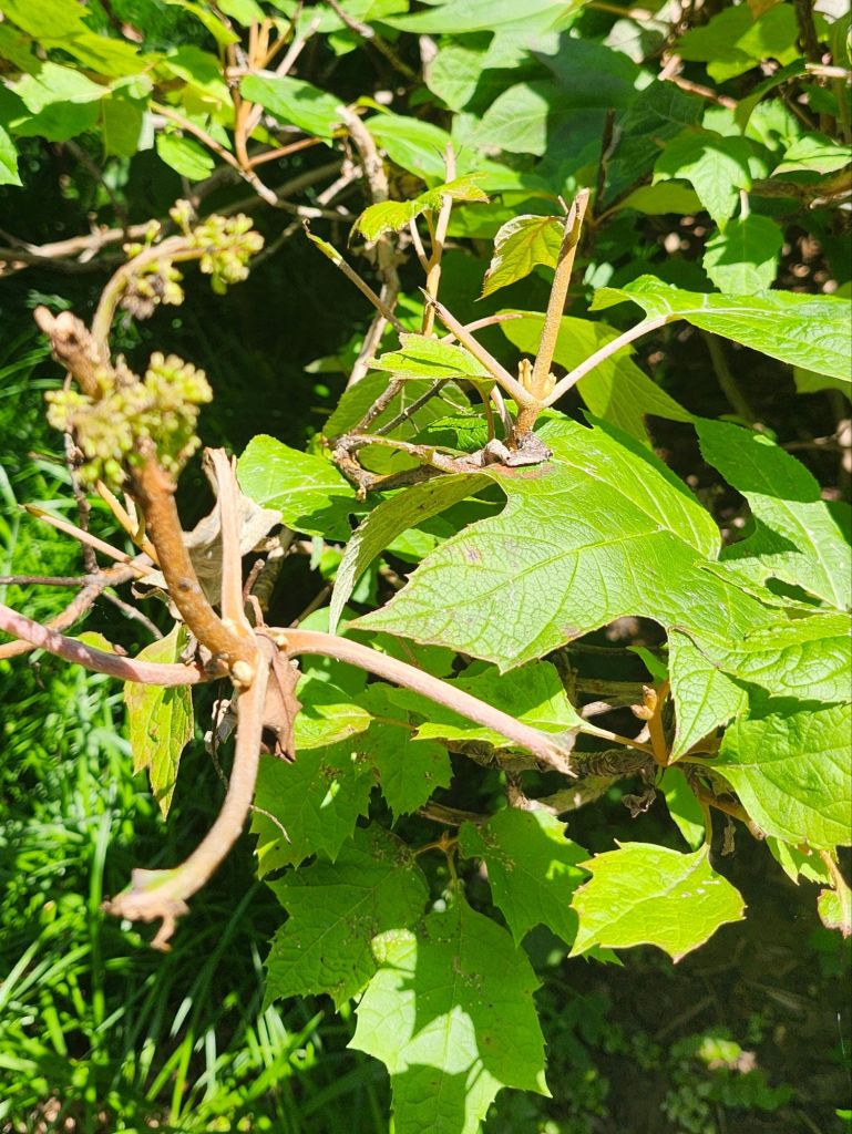 With ongoing cleanup of the fallen bigleaf magnolia, there is still time to stroll the garden. The ratio of work to play time is greatly skewed, with far more labor than I intend, but I will not miss a bloom. I notice that deer have nibbled several leaves and flowers of the sprawling oakleaf hydrangea (Hydrangea quercifolia, below) by the koi pond patio. I must follow up to spray the repellent, with a follow-up to several tall phlox also.