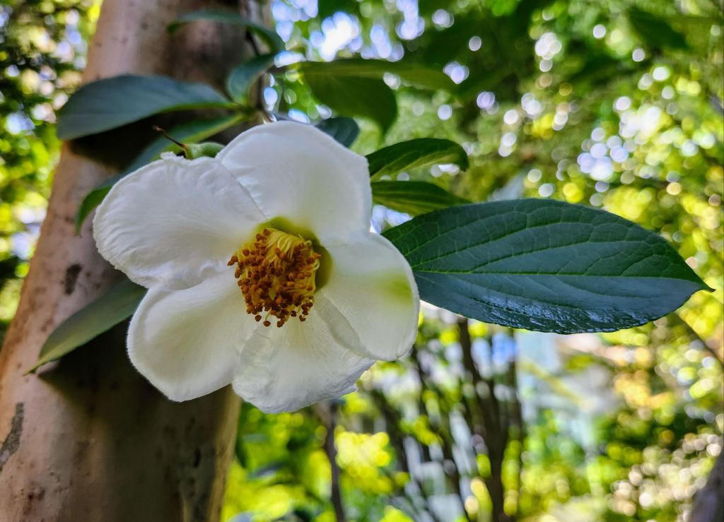 Walking the stone path above the lower circle patio is treacherous at the moment with slick, sodden blooms fallen from the stewartia (Stewartia pseudocamellia, below). Many flowers remain in the tree far above, but several are visible from the few lower branches. Uppermost blooms can be seen from the sunroom through the clutter of Japanese maples and the neighboring Samaritan dogwood.