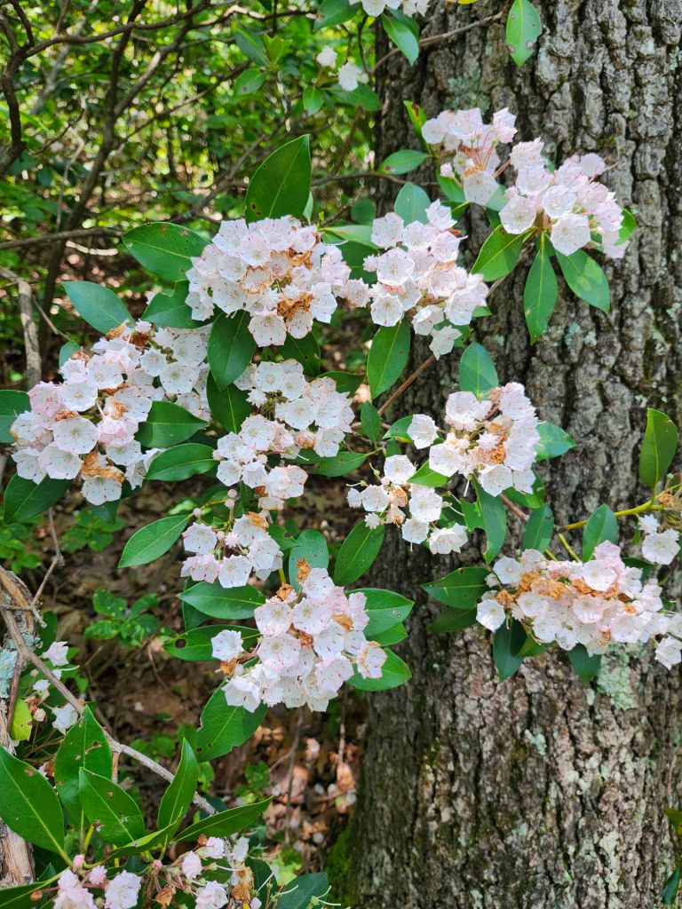 Closer to home, native mountain laurels (Kalmia latifolia, below) faded from bloom several weeks ago. On the Appalachian Trail at three thousand feet and higher, flowers are at their peak. Barbara and I were surprised and delighted to see so much flowering along this trail long after spring ephemerals had faded.
