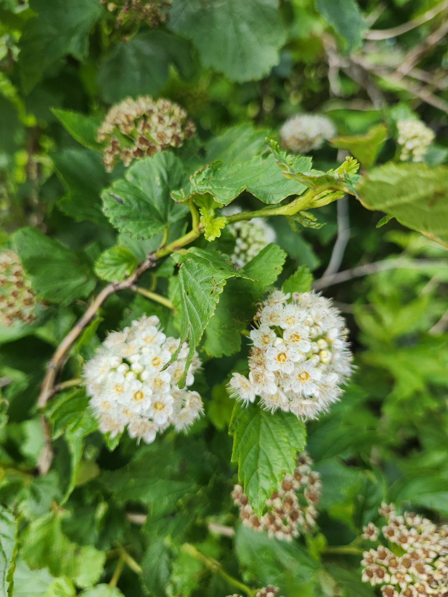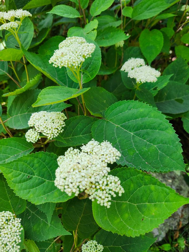 Smooth hydrangeas (Hydrangea arborescens, above) have been flowering in our garden in recent weeks, so it was not surprising to see many flowering at mid-elevations. A few hundred feet higher the hydrangeas were a few days from flowering. I must point out each plant of interest (to me) and explain the varied blooming times and of course, that garden varieties have been bred to have larger flowers and woodier stems so that the stems do not flop. While cultivated varieties often have large mophead flowers that obscure the fertile flowers, making pollination more difficult, we see many more pollinators in half-sun areas of the garden than in the shaded forest.