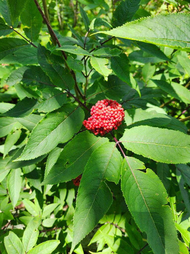 Elderberries (Sambucus racemosa, above) have moved from flowers we saw earlier in spring to clusters of red berries. There were many along the trail.