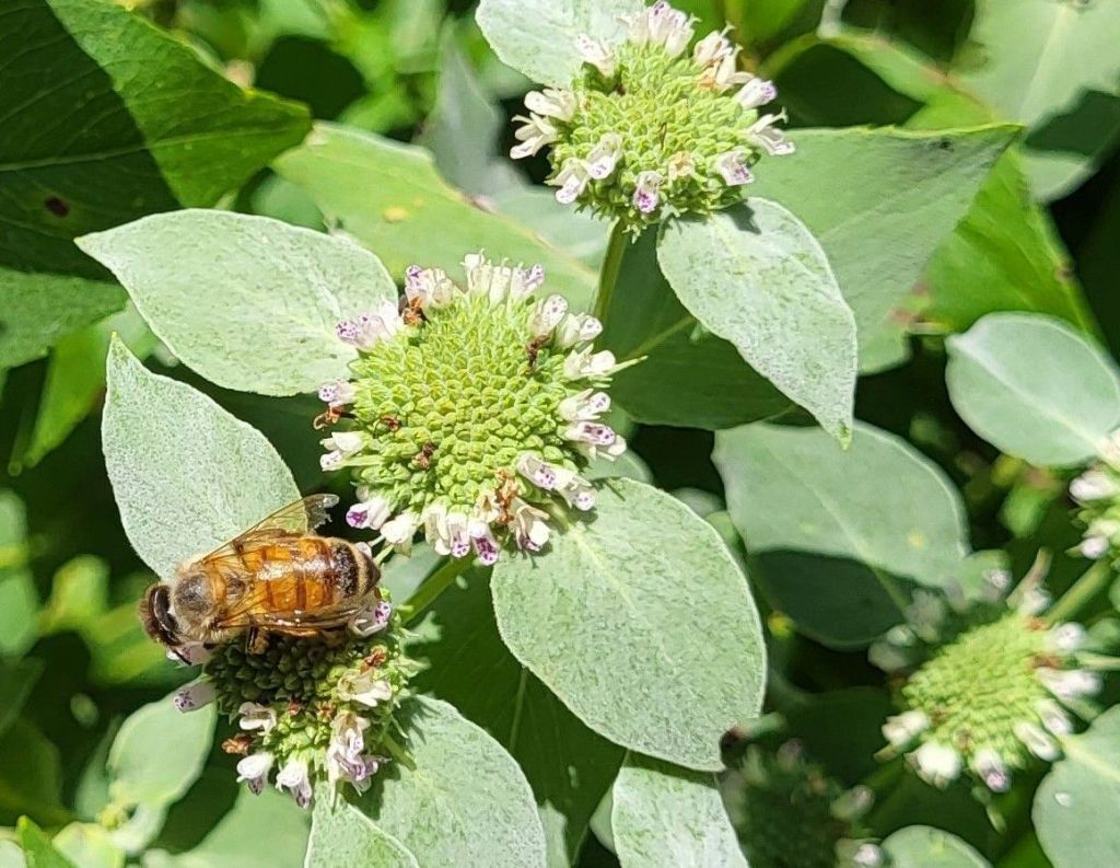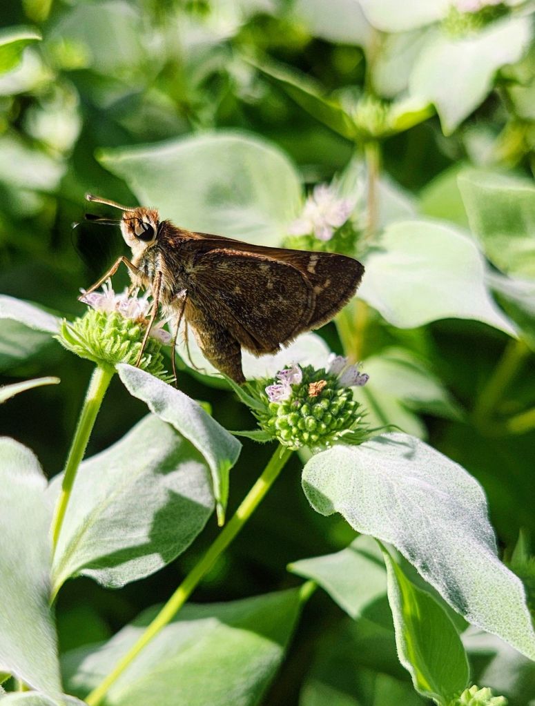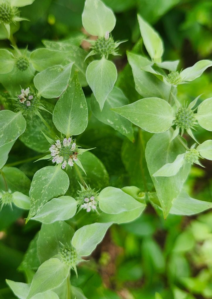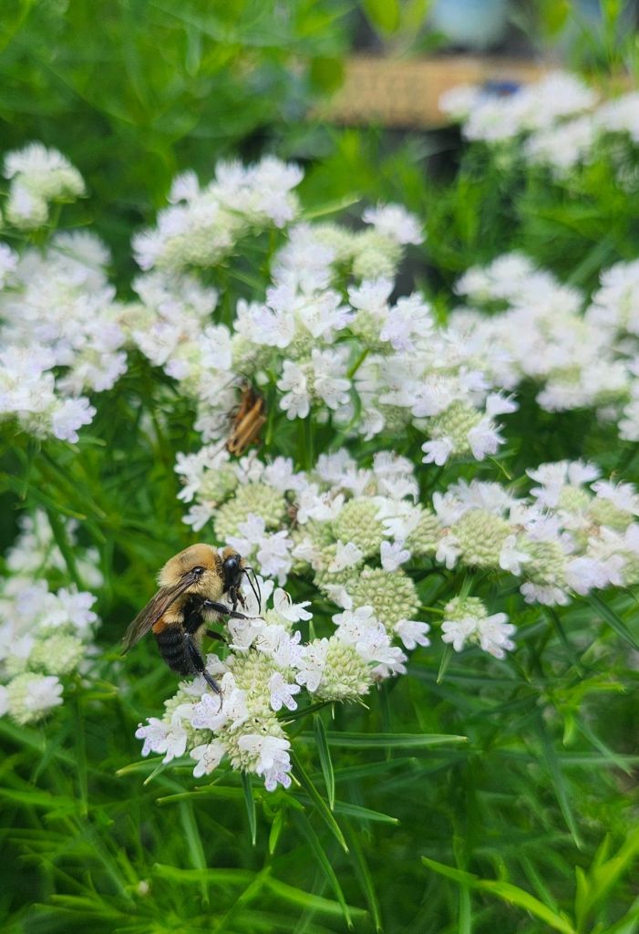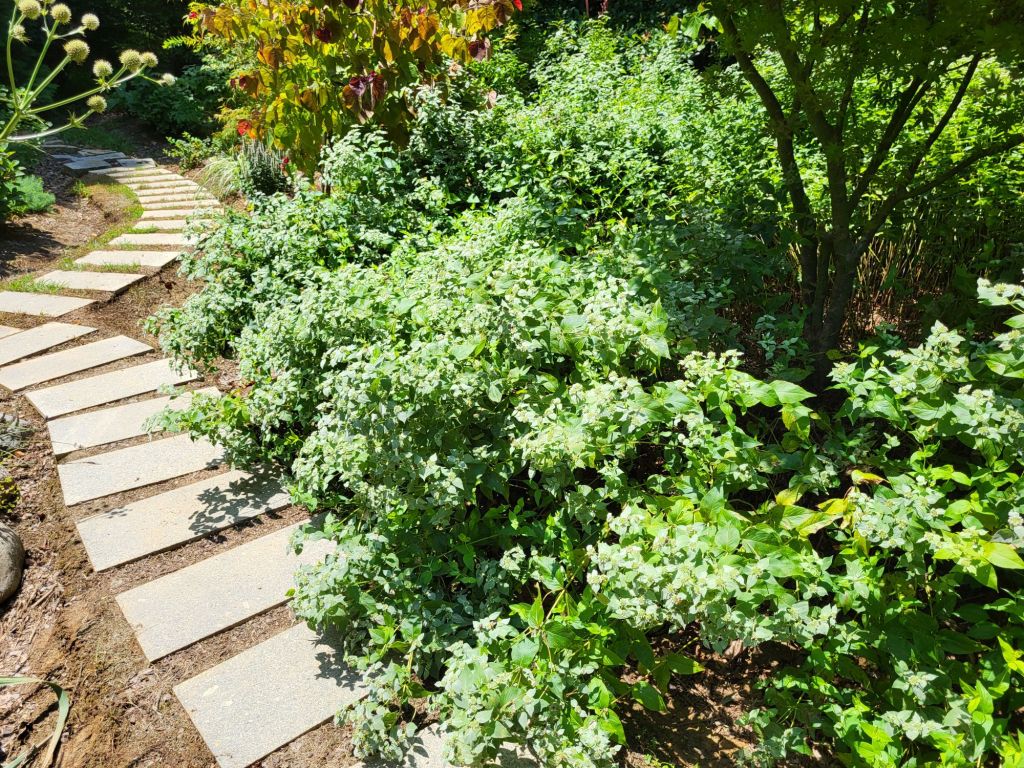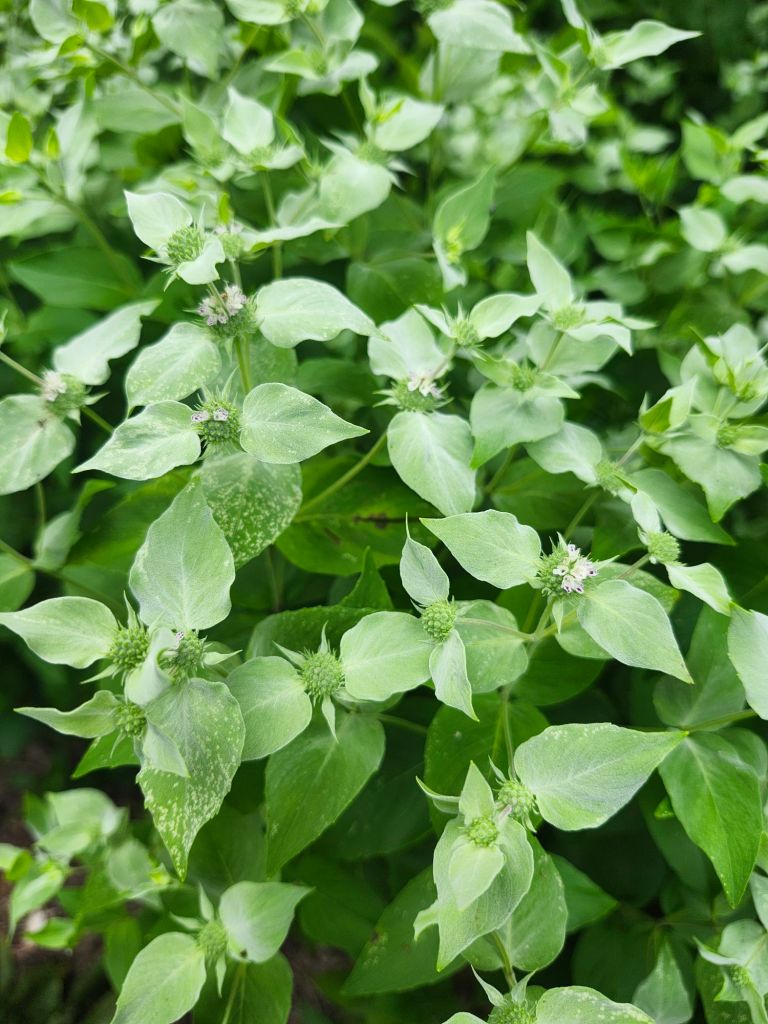 The identity of the third Mountain mint (below) is an open question. Planted a year ago, it appears identical to Blunt Mountain mint, so I’ll be interested to watch as it flowers. Again, it has limited space to spread into sunny areas, and there is no purpose in growing three varieties except my own interest. I’m certain it won’t matter to the pollinators.
