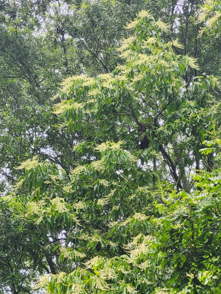 Beyond the maintenance chores demanded by the golden rain, it was planted too closely beside a sourwood (Oxydendrum arboreum, below) that is also flowering, but so far above that only I know it’s there. Again, this is the hazard of occupying a garden for thirty-six years as many trees have grown nearly to maturity (with many benefits). A properly considered planting would have one tree or the other. In this case, I would prefer the sourwood, a beautiful native of the southeast, though not locally.