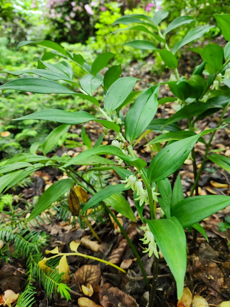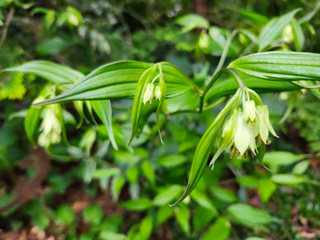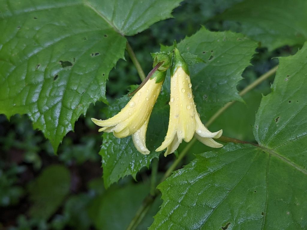 Certainly, a part of my failing is due to aging, but I suppose that my forgetfulness of details has worsened only slightly. So, excuse my temporary lapse in recalling that this wax bell is Kirengeshoma and then questioning if this is K. palmata (above) or K. koreana. Is another Disporum or Disporopsis? (below) The answers are floating around somewhere up there.