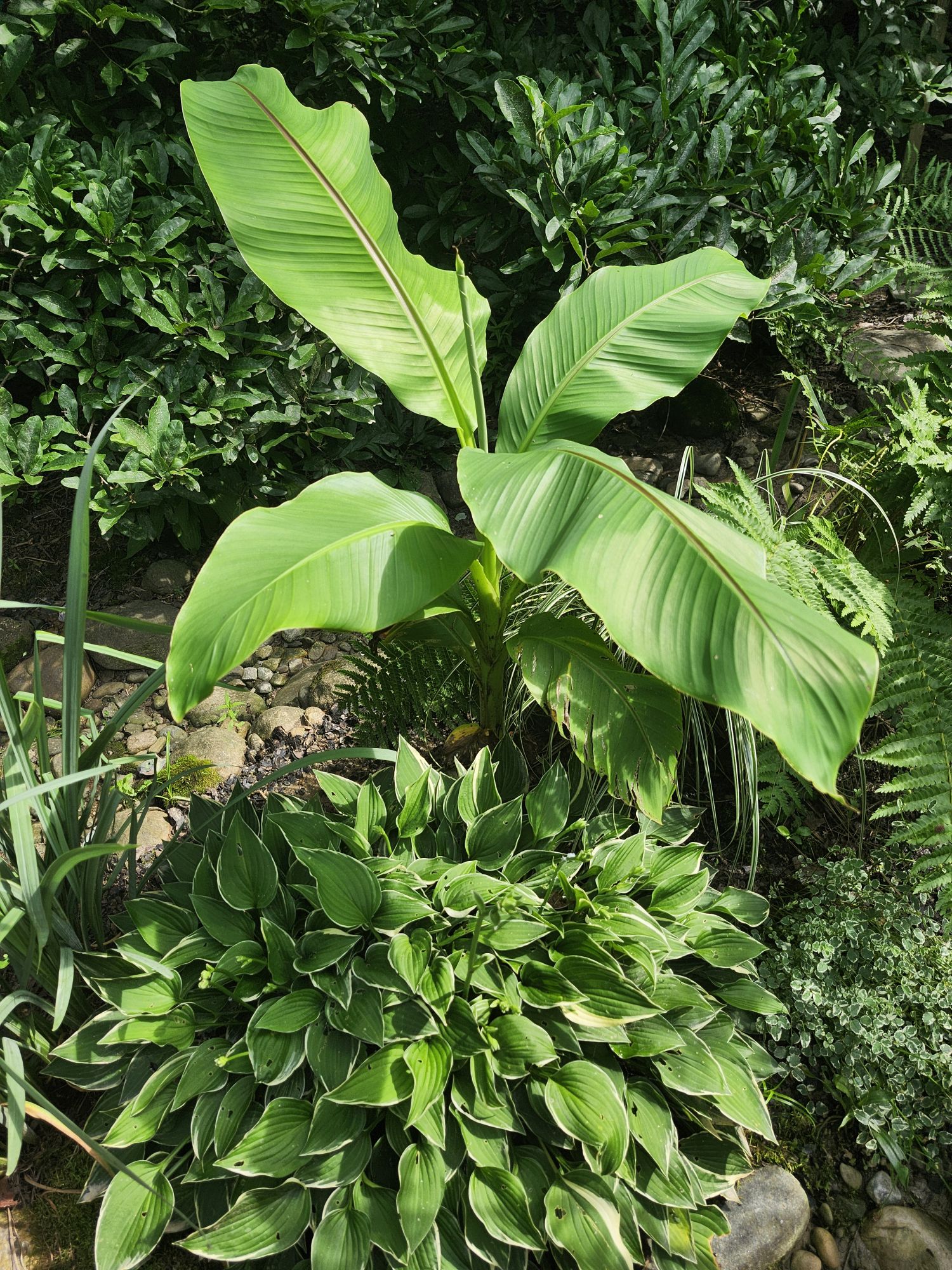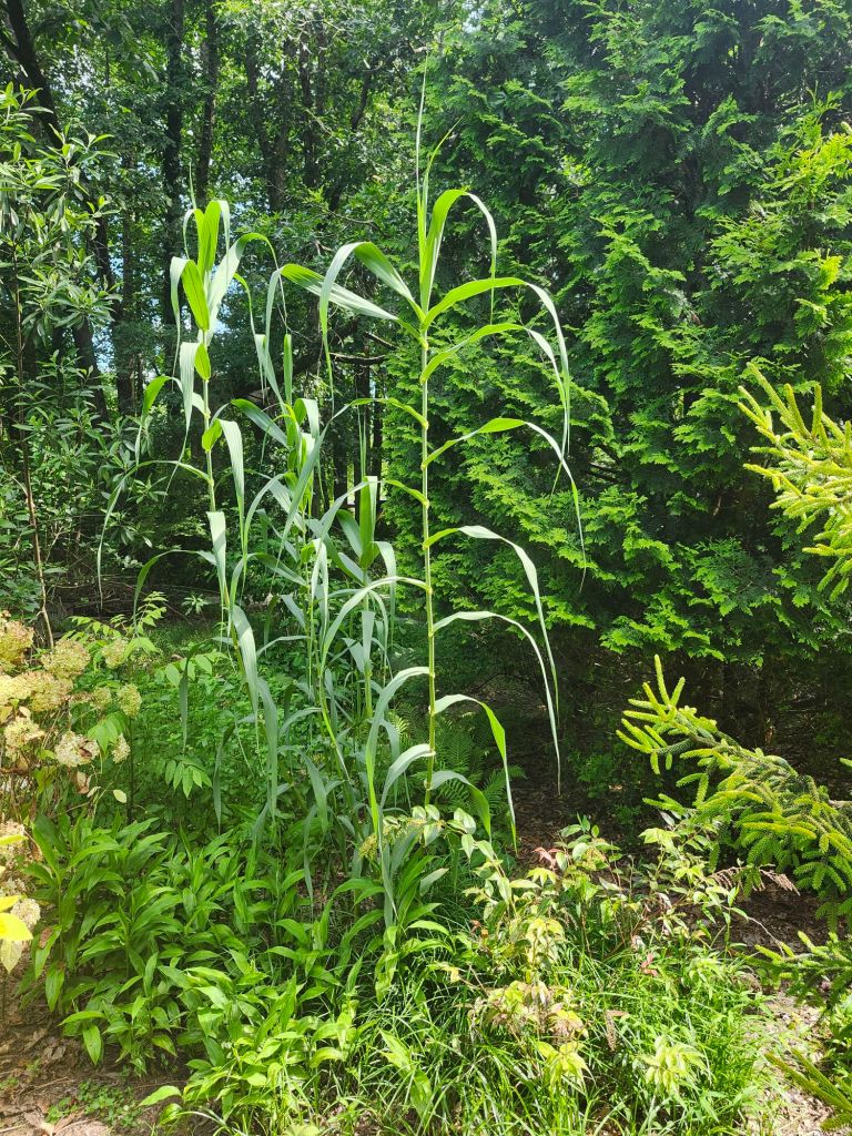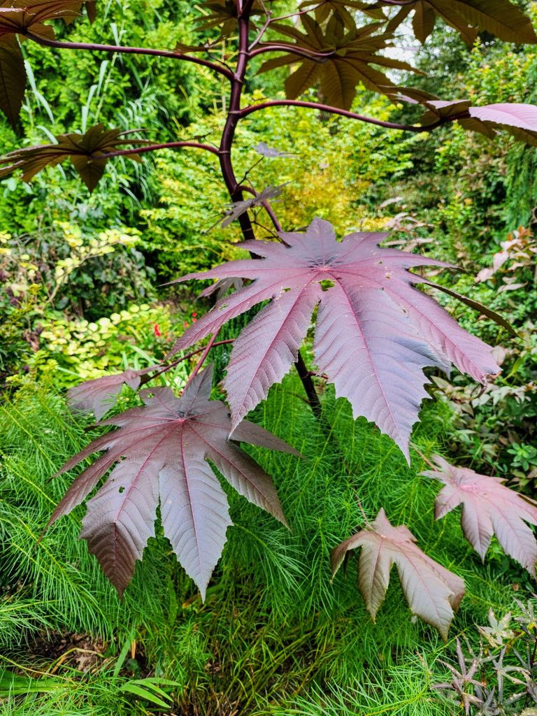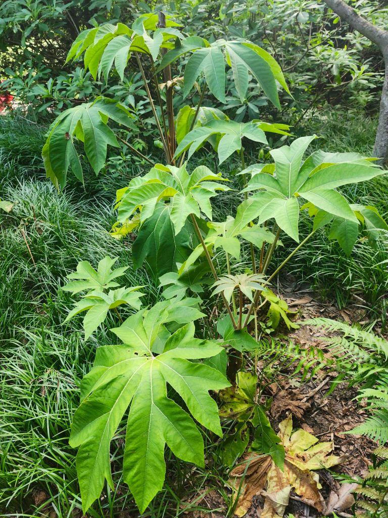 The cold hardy, but tropical-looking Rice Paper plant (Tetrapanax papyifera, above) has grown a few feet in recent weeks, so I expect it and the red-leafed Castor Bean (Ricinus communis, below) will grow substantially with the heat and rainfall that’s forecast. The hardy banana (Musa basjoo) should also jump a foot or more.
