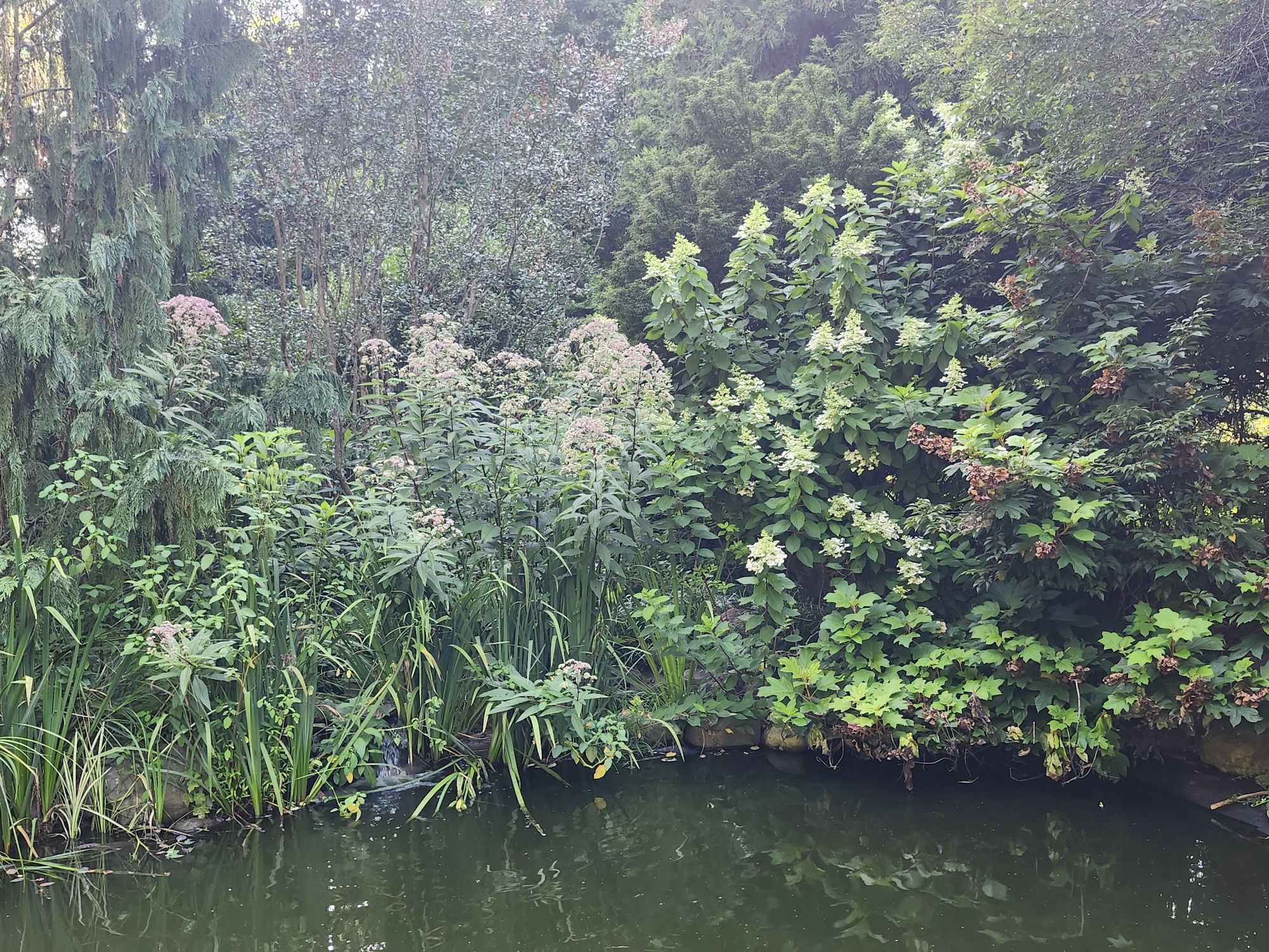 While the lower rear garden demands the greatest attention, the dozens of trees planted through the largest area ease its maintenance. Considerable work remains to clean up after the tall Bigleaf magnolia was uprooted in a late June storm, but the need for regular maintenance in the shaded areas is minimal.