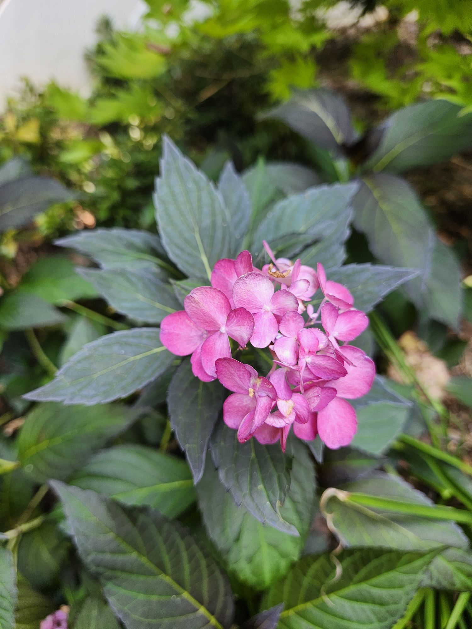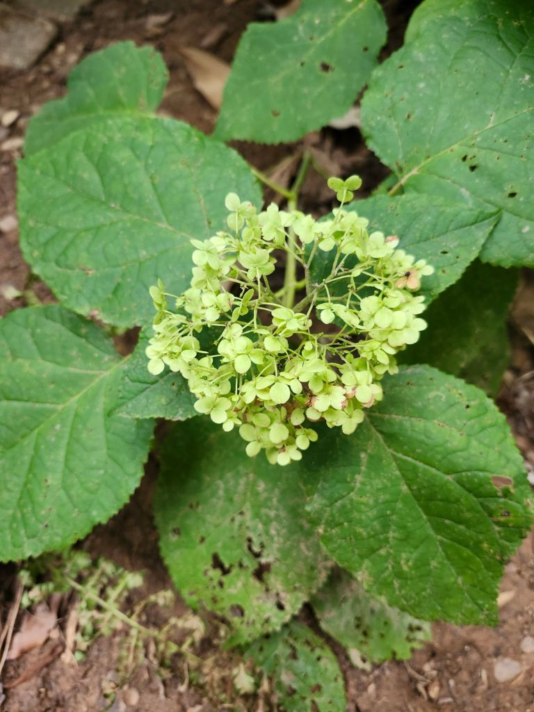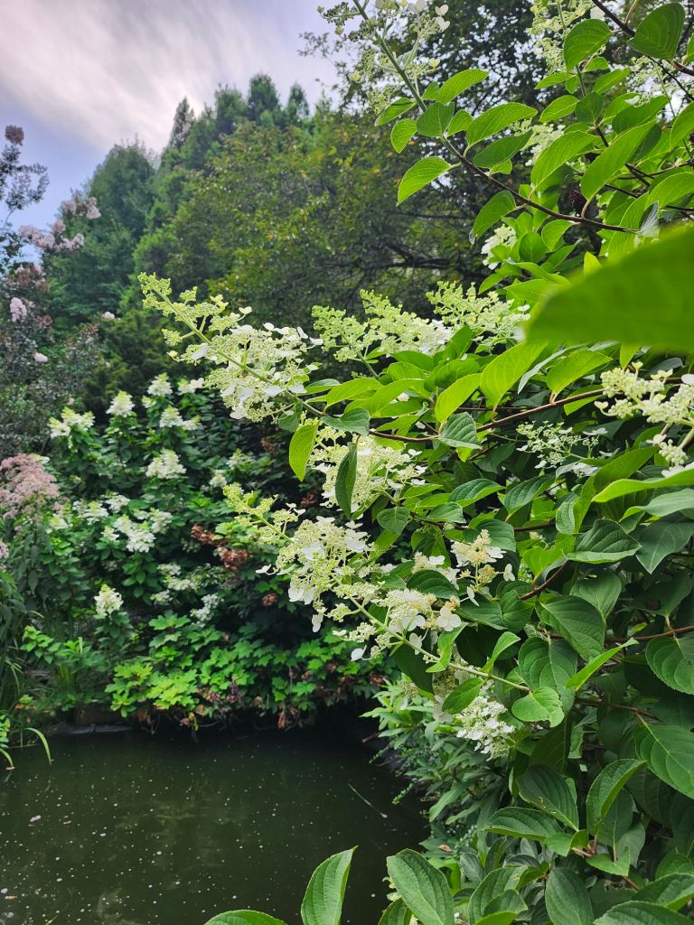 One oakleaf is struggling a bit after the large Bigleaf magnolia (Magnolia macrophylla) fell on it in a storm several weeks ago. Nothing was broken, and the debris was cleared after a few days, but it looks unhappy while other hydrangeas are thriving after our damp July. It’ll be okay, but along with a few others, it’s unlikely to flower in the dense shade of the side garden.