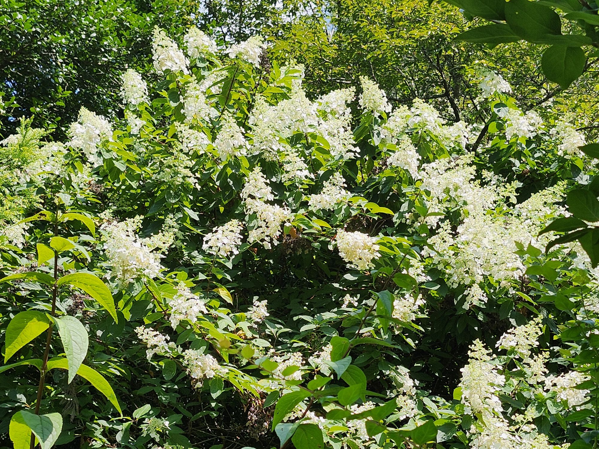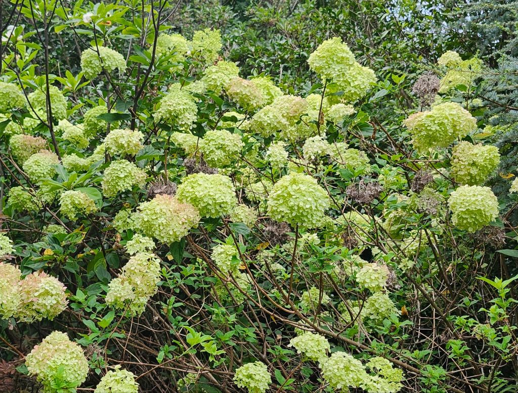 Smooth and panicled hydrangeas flower on the current year’s growth, so all flowered fully. Surprisingly, smooth hydrangeas (Hydrangea arborescens, above) suffered in the prolonged dampness through July. Flowers faded and much of tbe foliage turned brown. As rainfall became more scattered they have recovered, but one has lost all leaves.