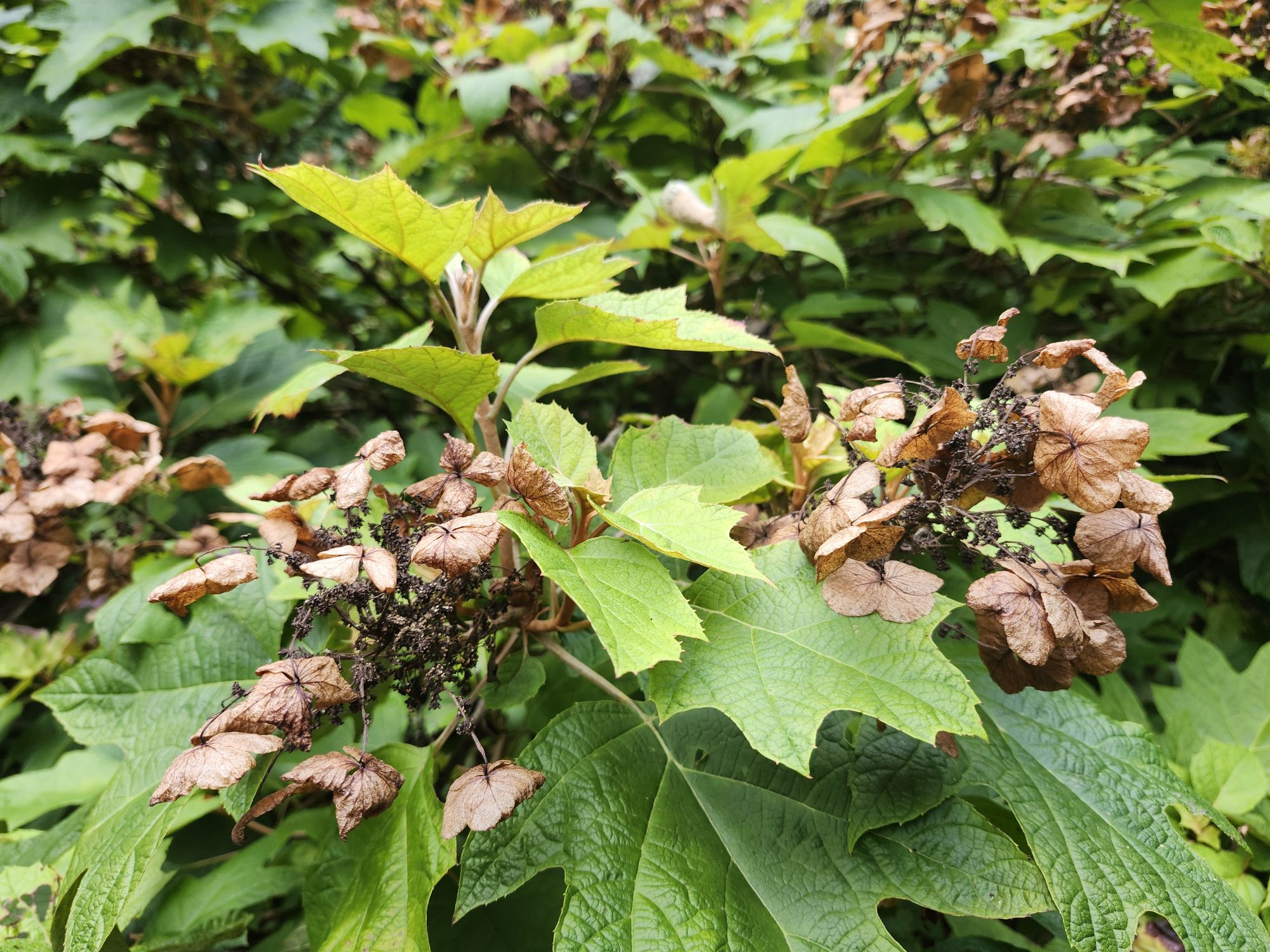 Typically, flowers of Oakleaf hydrangeas (Hydrangea quercifolia, below) fade gracefully to pink then tan despite scorching summer temperatures. But, not this year when they have quickly turned brown. Perhaps this is due to the abundant rainfall through July, but as is often the case, the cause is unclear.