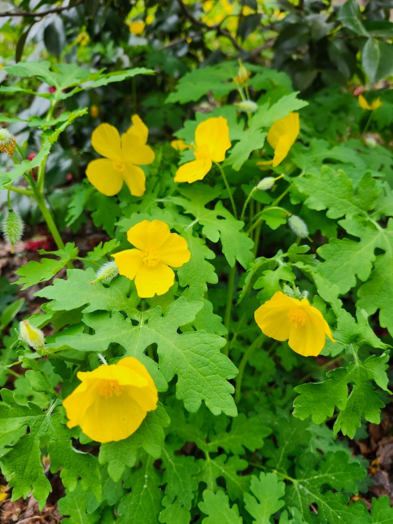 While many folks disparage Robb’s spurge as too aggressive, I considered it attractive and also useful in covering dry soil beneath maples, tulip poplars, and a black gum. Green and Gold (Chrysogonum virginianum, above) and wood poppies (Stylophorum diphyllum, below) thrive in nearby shade, but they don’t creep further into the deeper shade once inhabited by the spurge. With the soil bare, I’ll transplant some Green and Gold to give it another try, but I’ll probably plant a few hostas and ferns to fill in while I figure what else to plant.