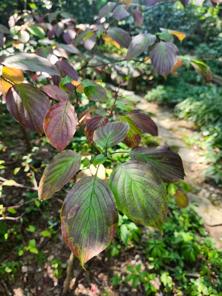 The second Pagoda dogwood grows in damper ground, which it tolerates while it doesn’t thrive. With less runoff from the storms, its surrounding soil is damp but not saturated, so it has suffered less. Its leaves are turning to the dogwood’s autumn shades (above), but that shouldn’t be a problem as autumn approaches. The taller dogwood has lost every leaf, so there’s reason for concern, though I see new leaf buds starting at branch tips. I expect both dogwoods will survive unless heavy rainfall returns for an extended period.