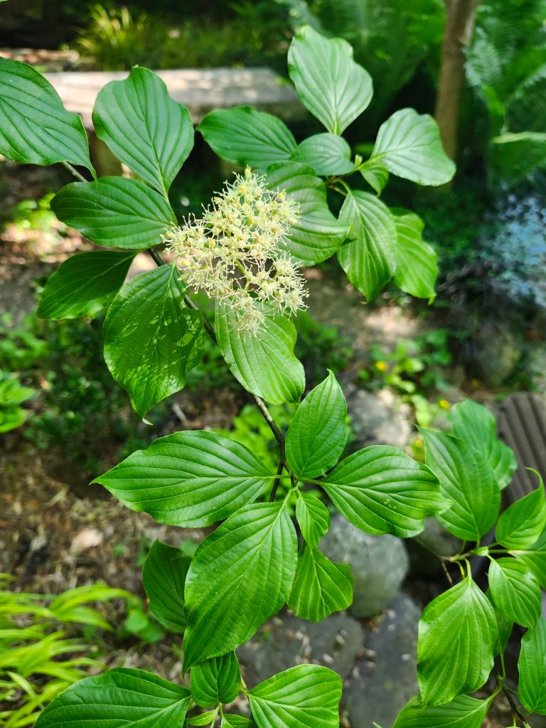 Unfortunately, there’s more. A few years ago I was elated to obtain two Pagoda dogwoods (Cornus alternifolia, above) five feet tall with good branching. Both have grown happily in slightly damp soil and part shade, though one that is in drier ground has nearly doubled in height. But, it’s now suffering, defoliating as the small pond above it overflows. The soil is typically slightly damp, but now it’s too much.