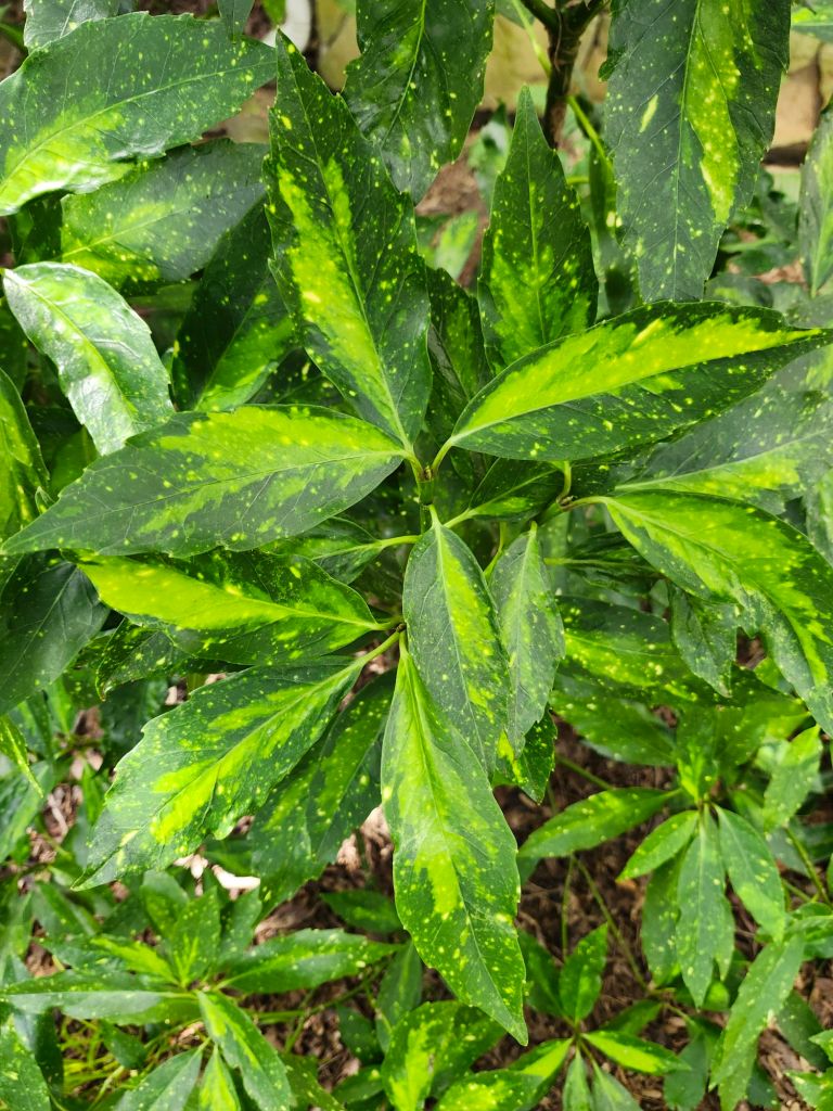 Leaves of several aucubas (Aucuba japonica, above) in areas where runoff was most evident began to wilt after weeks of wet soil. With drier weather, I expect most should survive after a bit of pruning.