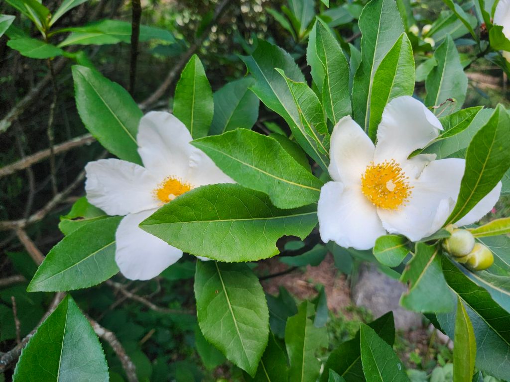 The flowers of gordlinia are familiar (above), nearly identical to ones of Franklinia, but also similar to related camellias and stewartia. Franklinia and gordlinia share this period in August to reach their peak bloom, and along with its recent growth are more abundant flowers.