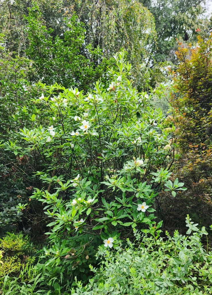 I have habitually referred to the Gordlinia (x Gordlinia grandiflora, below) as a shrubby tree with its dense growth and comparative lack of height. No longer. While still multi-branched, I see that I must now accept that it has achieved tree status as it has grown to ten feet or slightly taller.