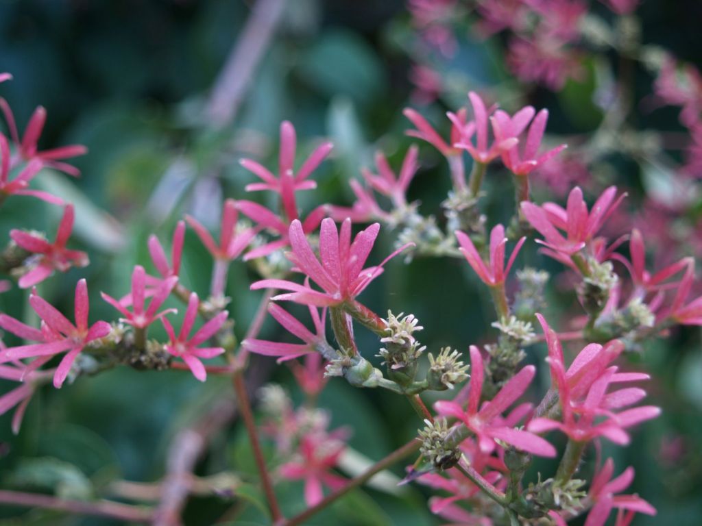 The Seven Son’s clustered white flowers are unremarkable, though still welcome in late summer. The blooms are favored by bees, but after the flowers fade, red sepals (above) are ornamental through early autumn. In both positions in the garden, the Seven Sons are splendid small trees. After a lengthy wait, I was pleased to find the two that have quickly grown to fill their spots. A red horse chestnut (Aesculus x carnea) that has become a favorite replaced the original Seven Son that was damaged, and how lucky to now have the horse chestnut and the Seven Sons.