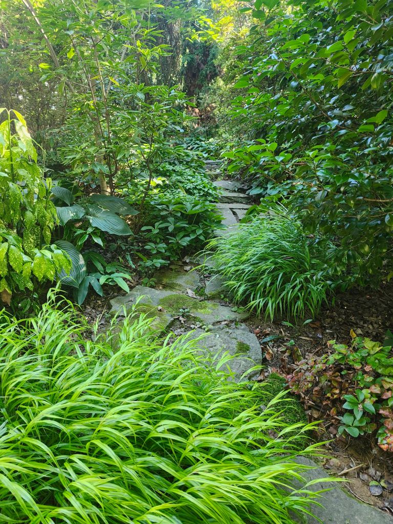 Despite the dryness, I’ve been moving a few plants. I’m still reviewing ideas to fill the space of the bigleaf magnolia (Magnolia macrophylla) that fell in late June. I think the mid-afternoon glimpse of direct sun is good for the side garden, but visually, more is needed.