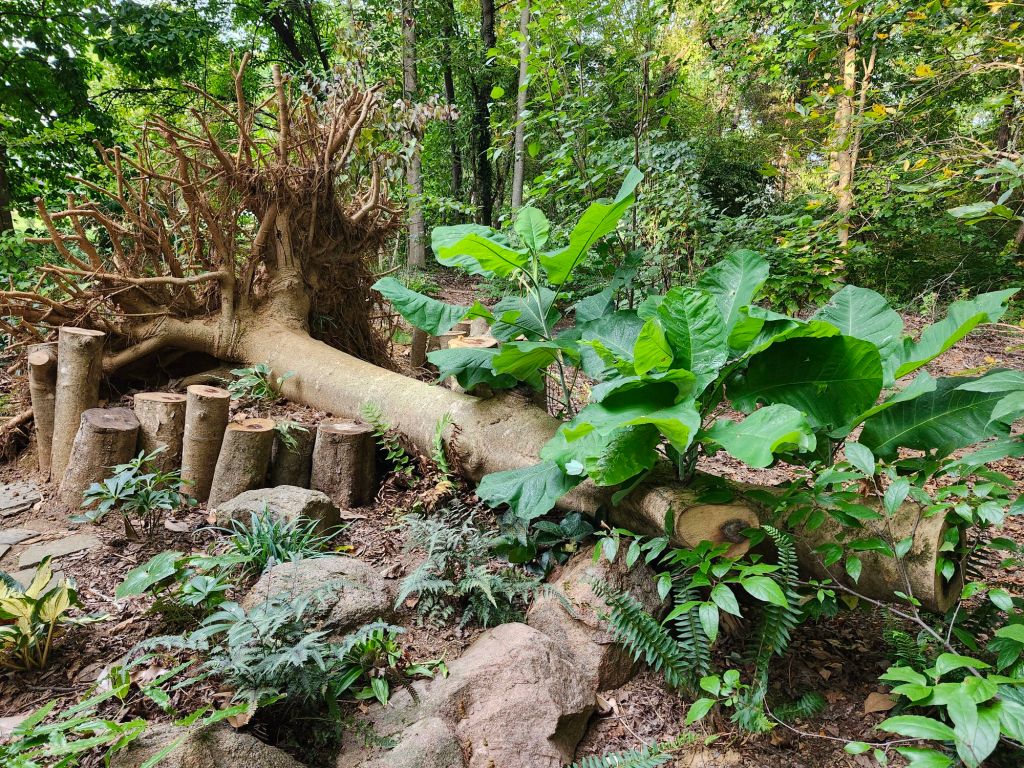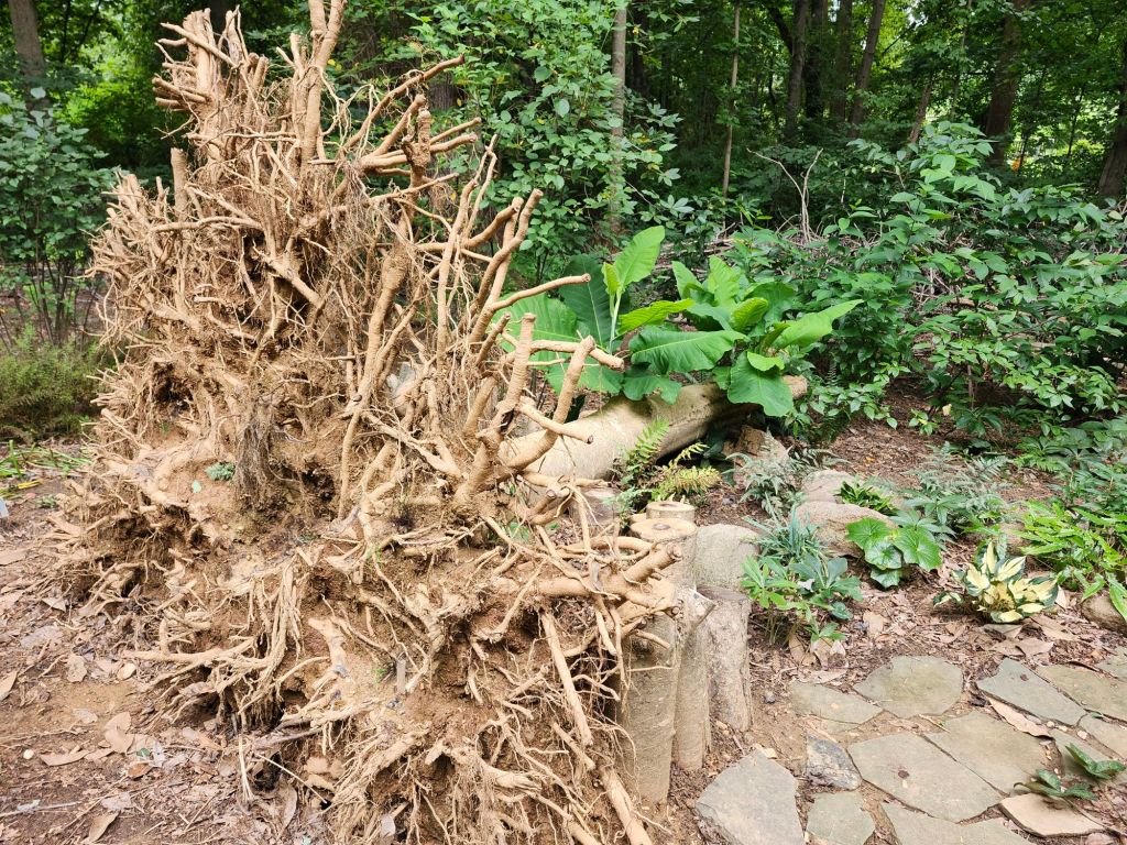 Today, the roots of my treasured magnolia jut into the open sky with ten feet of trunk lying parallel to the ground. These will remain, though in what form I’m uncertain. A considerable mess of branches has been pushed aside to tidy up with cooler temperatures. That is likely to coincide with the fading of the magnolia’s leaves and the transplanting of the seedling. I will have planted a smaller tree, a redbud or dogwood more appropriate for the space with mature neighboring trees.