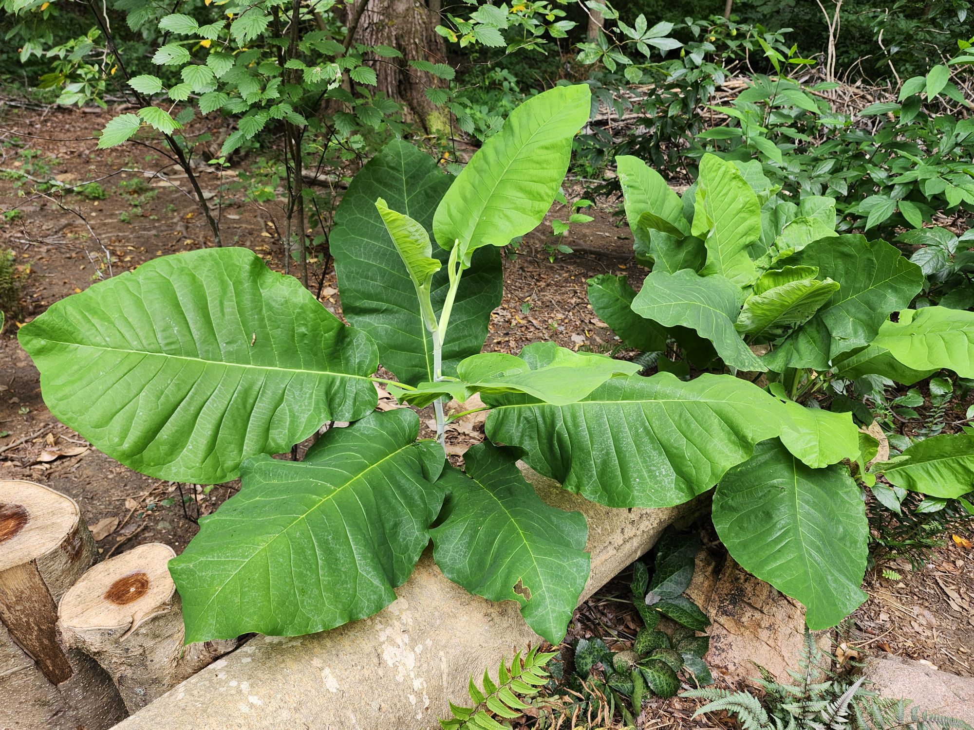 The bigleaf magnolia (Magnolia macrophylla, below) refuses to die, though it toppled over roots and all in a late June storm. I’ve removed the bulk of the large tree, but the roots and a section of the lower trunk remain as a feature of the garden since too much work would be required to dispose of these.